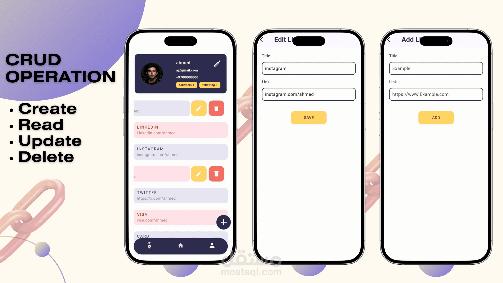 يوفر التطبيق ميزات إدارة الروابط مثل الإضافة والتعديل والحذف، بالإضافة إلى إمكانية البحث عن مستخدمين آخرين وعرض ملفاتهم الشخصية. كما يحتوي على نظام متابعة بين المستخدمين، مع تحديث لحظي لحالة المتابعة. يعتمد التطبيق على Provider لإدارة الحالة، وعلى بنية منظمة تشمل نماذج بيانات، مستودعات للتعامل مع الـ API، ومجموعة من الواجهات والمكوّنات القابلة لإعادة الاستخدام.