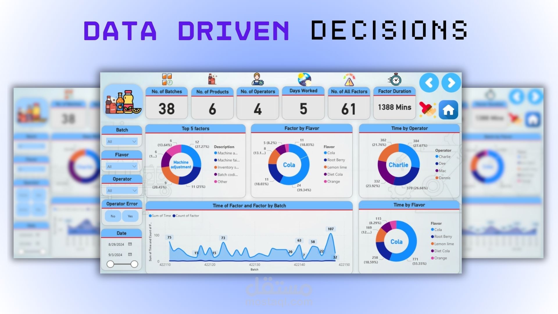 This Dashboard analyzes 5 days of production, involving 4 operators producing 6 different products across 38 batches. The analysis highlights significant downtime issues, primarily centered around one flavor and machine reliability.