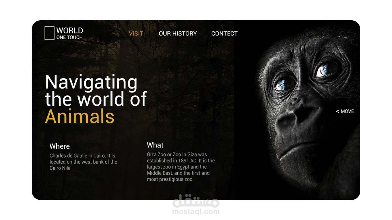 قمت بتصميم واجهة مستخدم احترافية لموقع بعنوان WORLD ONE TOUCH، وهو موقع يقدّم تجربة تفاعلية لاستكشاف عالم الحيوانات بطريقة حديثة بصريًا وجذابة. التصميم يركّز على المزج بين الصور عالية الجودة والمحتوى الموجه للمستخدم، بحيث يقدم إحساس واقعي و immersive للزائر.