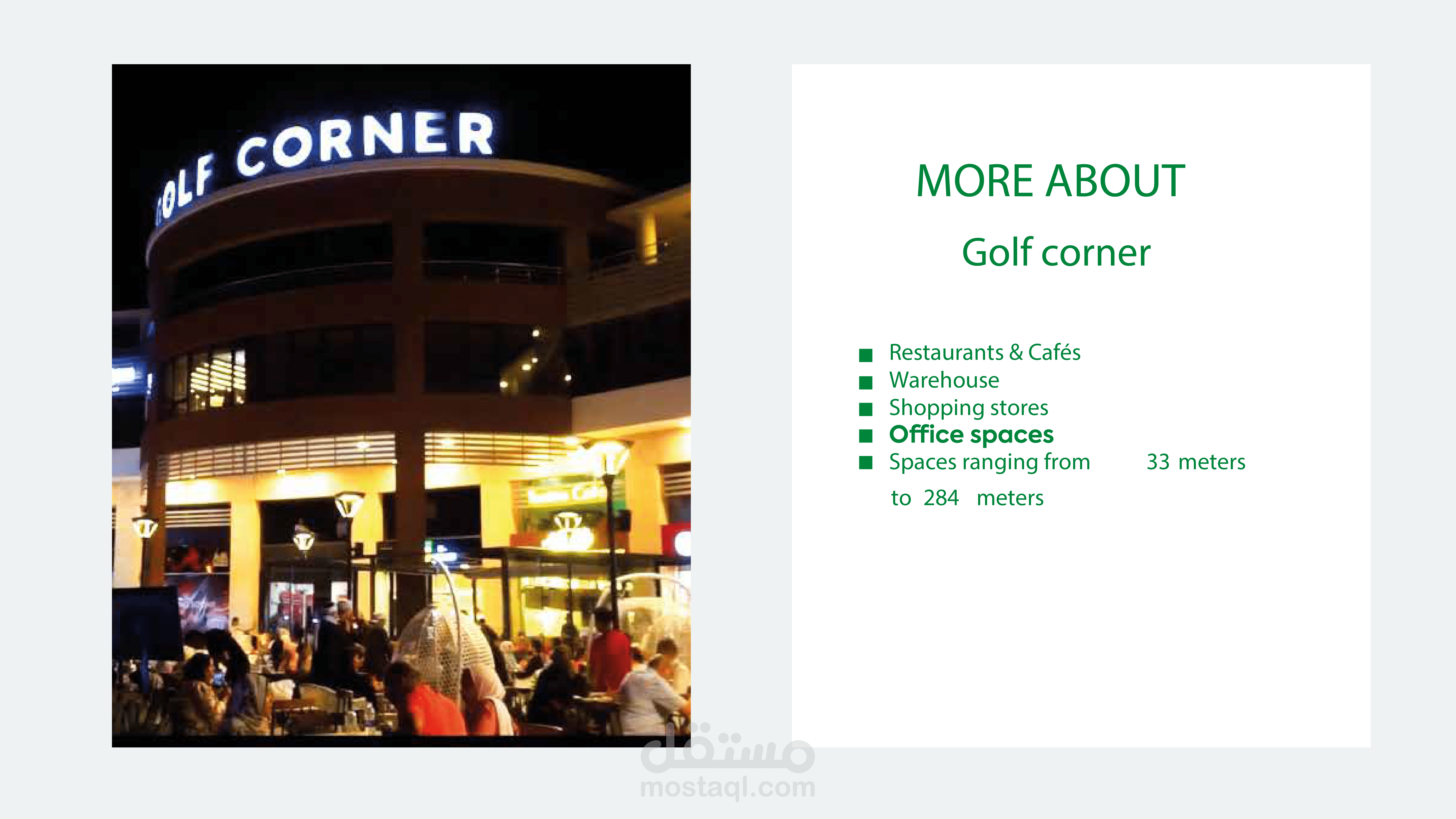 هذا الـ Presentation صُمّم ليقدّم صورة قوية وجذابة عن Golf Corner & Business Park & Greens Mall، ويُسهّل عملية العرض أمام العملاء والمستثمرين بشكل راقٍ ومؤثر.