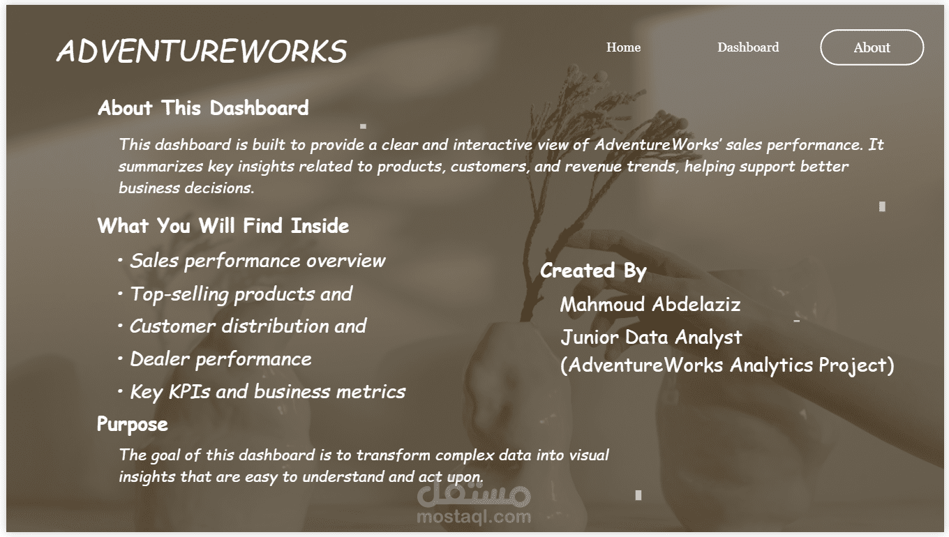قمت بتطوير لوحة معلومات تفاعلية لتحليل بيانات شركة AdventureWorks، بهدف تقديم رؤى دقيقة لدعم اتخاذ القرارات الاستراتيجية.