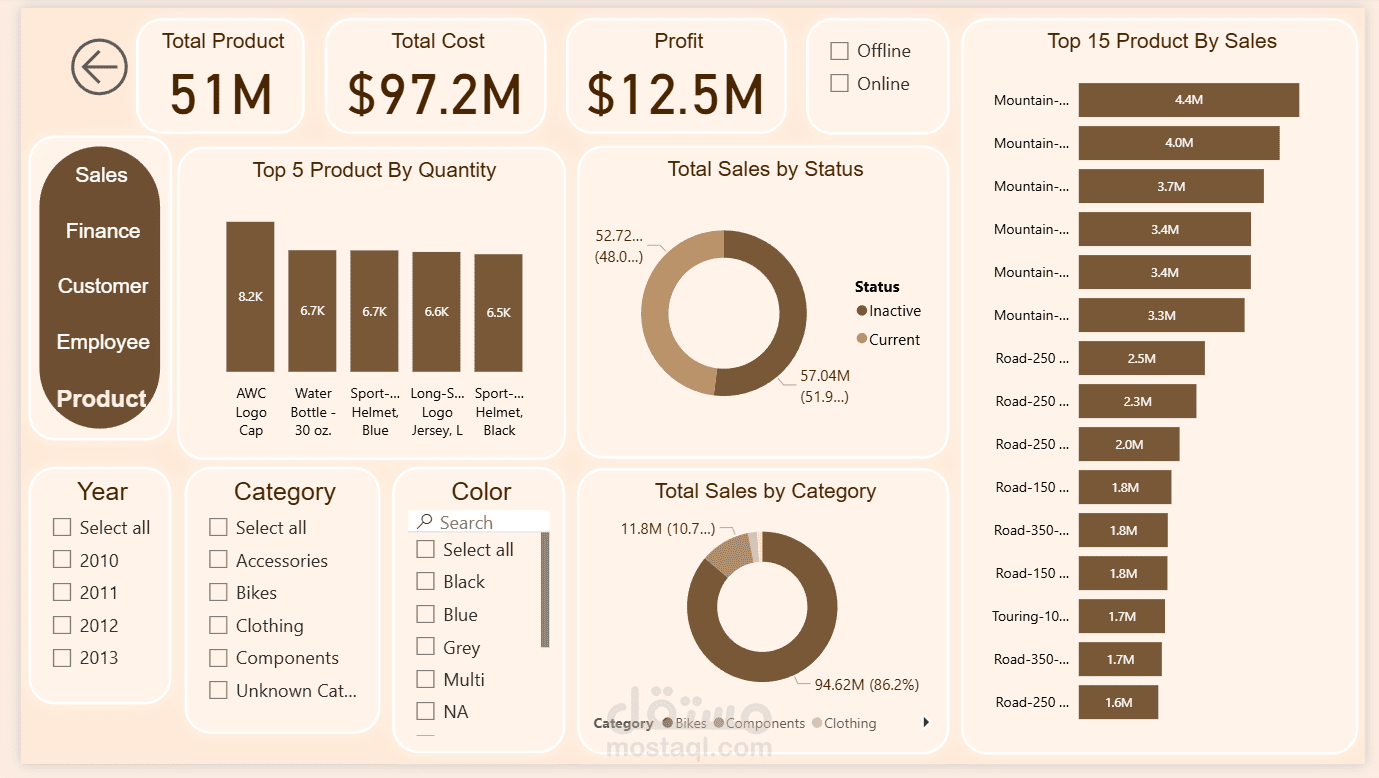 Product Dashboard: تحديد المنتجات الأعلى مبيعًا وتحليل الفئات المختلفة.