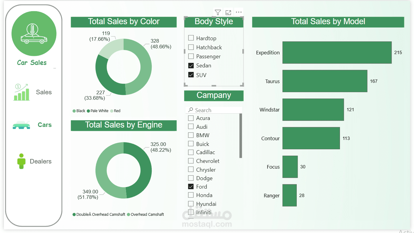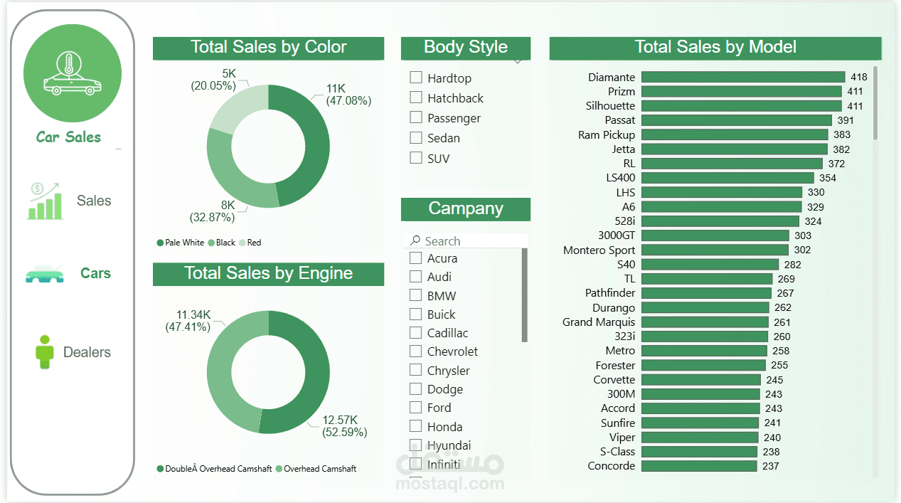 Slicers وFilters لاستكشاف أنواع السيارات أو العلامات التجارية المحددة.
