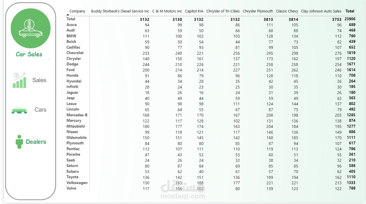 أداء وكلاء السيارات وعدد السيارات التي باعها كل وكيل حسب العلامة التجارية.