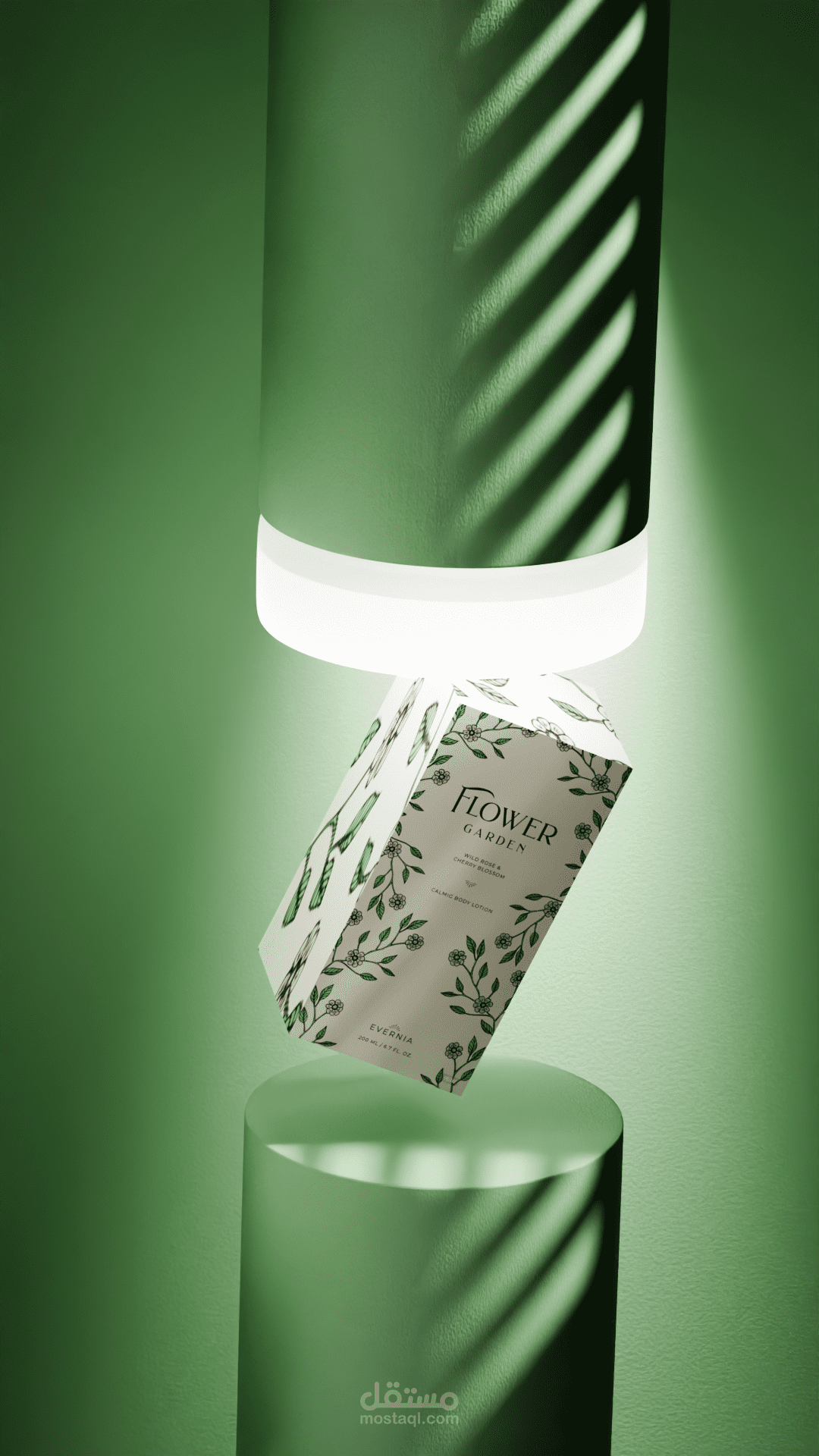 تم تصميم المشهد باستخدام برنامج Blender ، حيث يظهر Packaging بشكل نظيف وبخلفية خضراء هادئة مع إضاءة ناعمة تعطي إحساسًا طبيعيًا ومنعشًا.