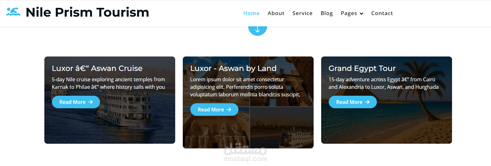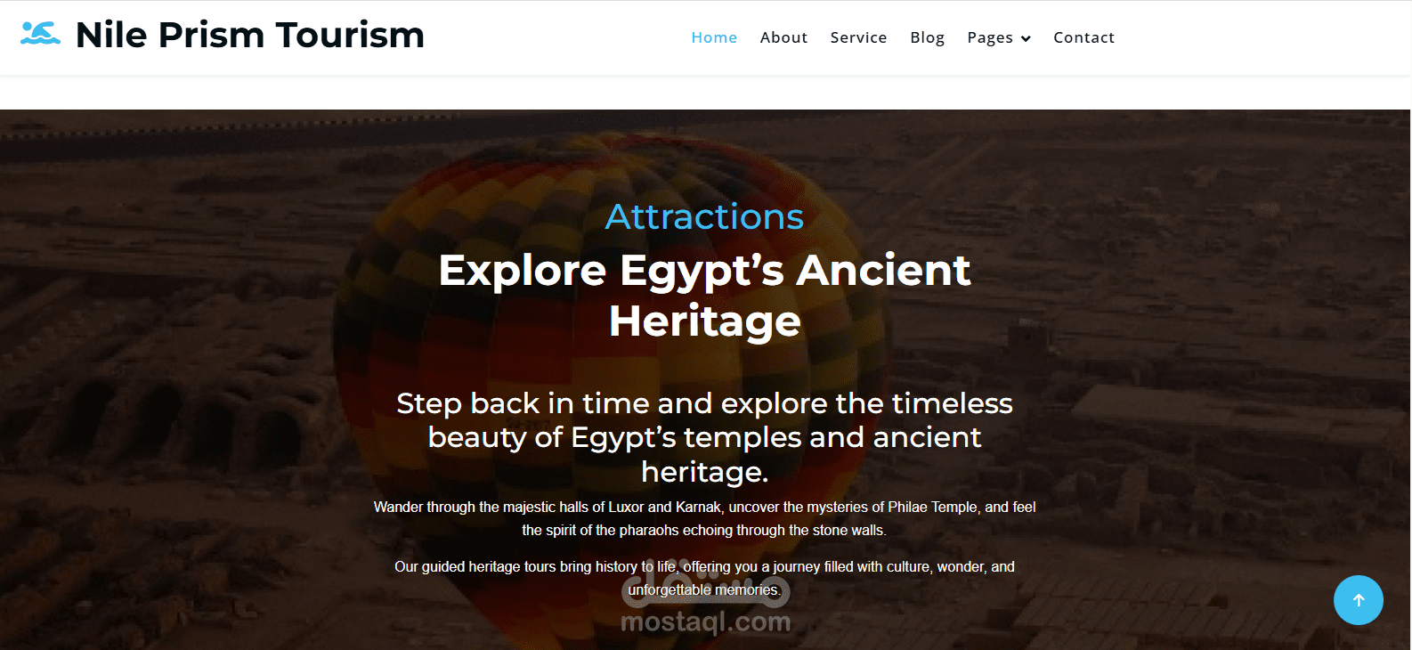 موقع سياحي استكشاف نهر النيل وتجارب سياحية متنوعة وملونة يسلط الضوء على جمال مصر، تاريخها، وثقافتها. يجب أن يشمل الموقع الأقسام التالية: