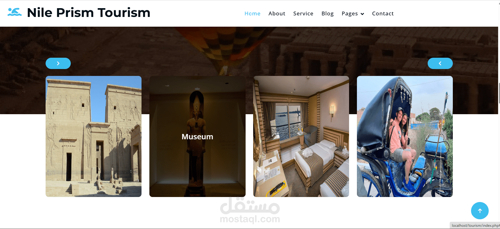 الصفحة الرئيسية: تحتوي على رسالة ترحيبية وتسليط الضوء على أهم معالم مصر السياحية.