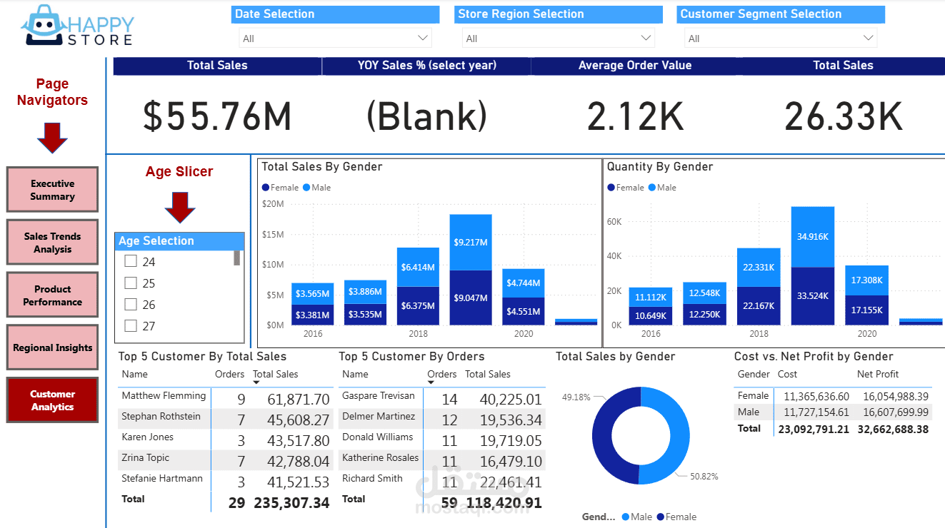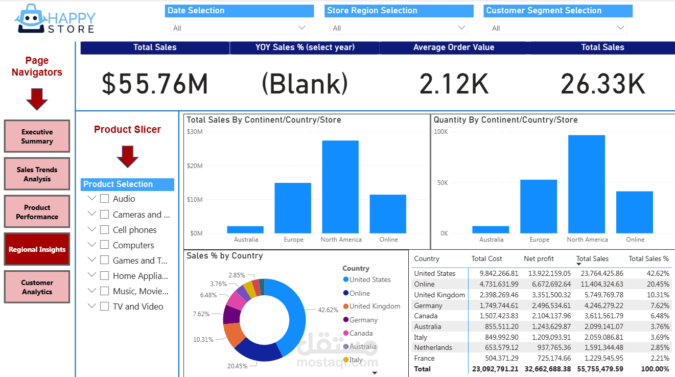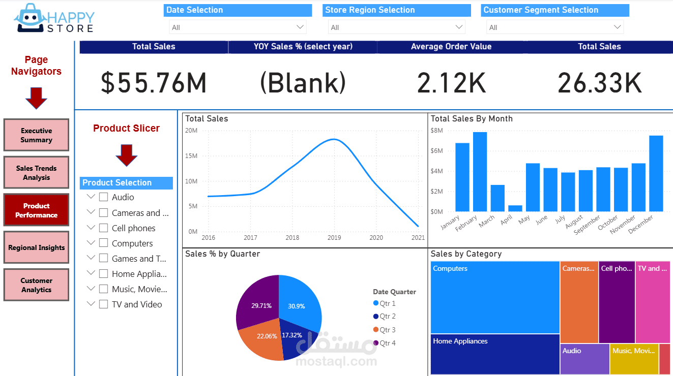 -Dashboard Development: Executive Summary, Sales Trends, Product Performance, Regional Insights, and Customer Analytics.