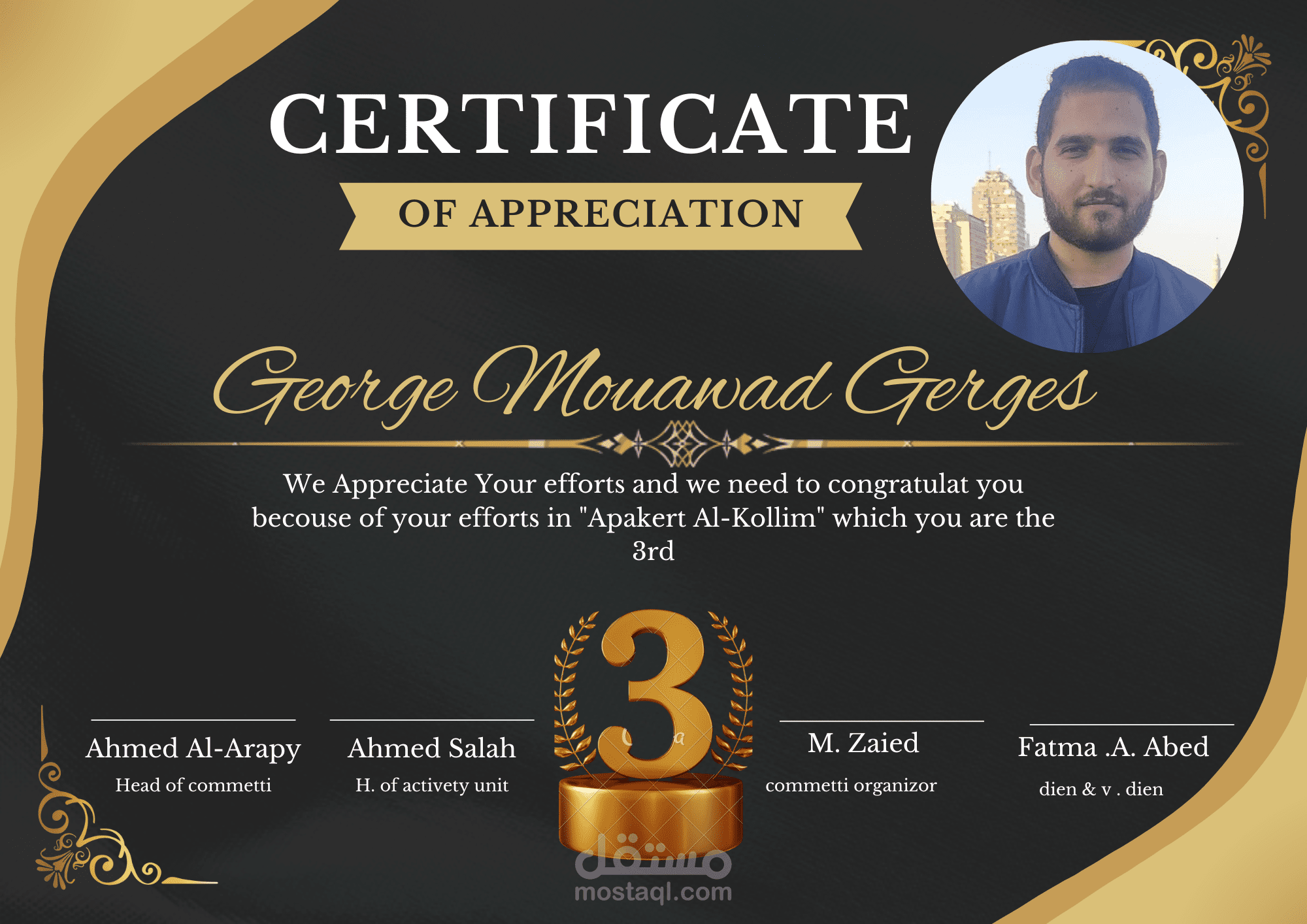 أصمّم شهادات تقدير احترافية تجمع بين الأناقة والوضوح، مع الاهتمام بالتفاصيل التي تعكس قيمة المناسبة وصورة الجهة المانحة. أعمل على تنسيق النصوص بشكل متوازن، واختيار ألوان وخطوط رسمية وواضحة، مع إمكانية إضافة الهوية البصرية والشعار الخاص بالعميل. أصمّم الشهادة بصيغة جاهزة للطباعة والاستخدام الرقمي، مع توفير نسخة مفتوحة للتعديل عند الحاجة.