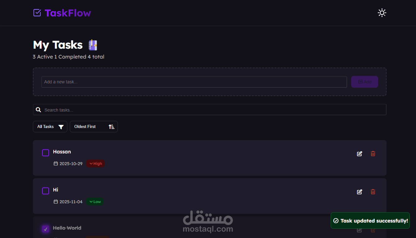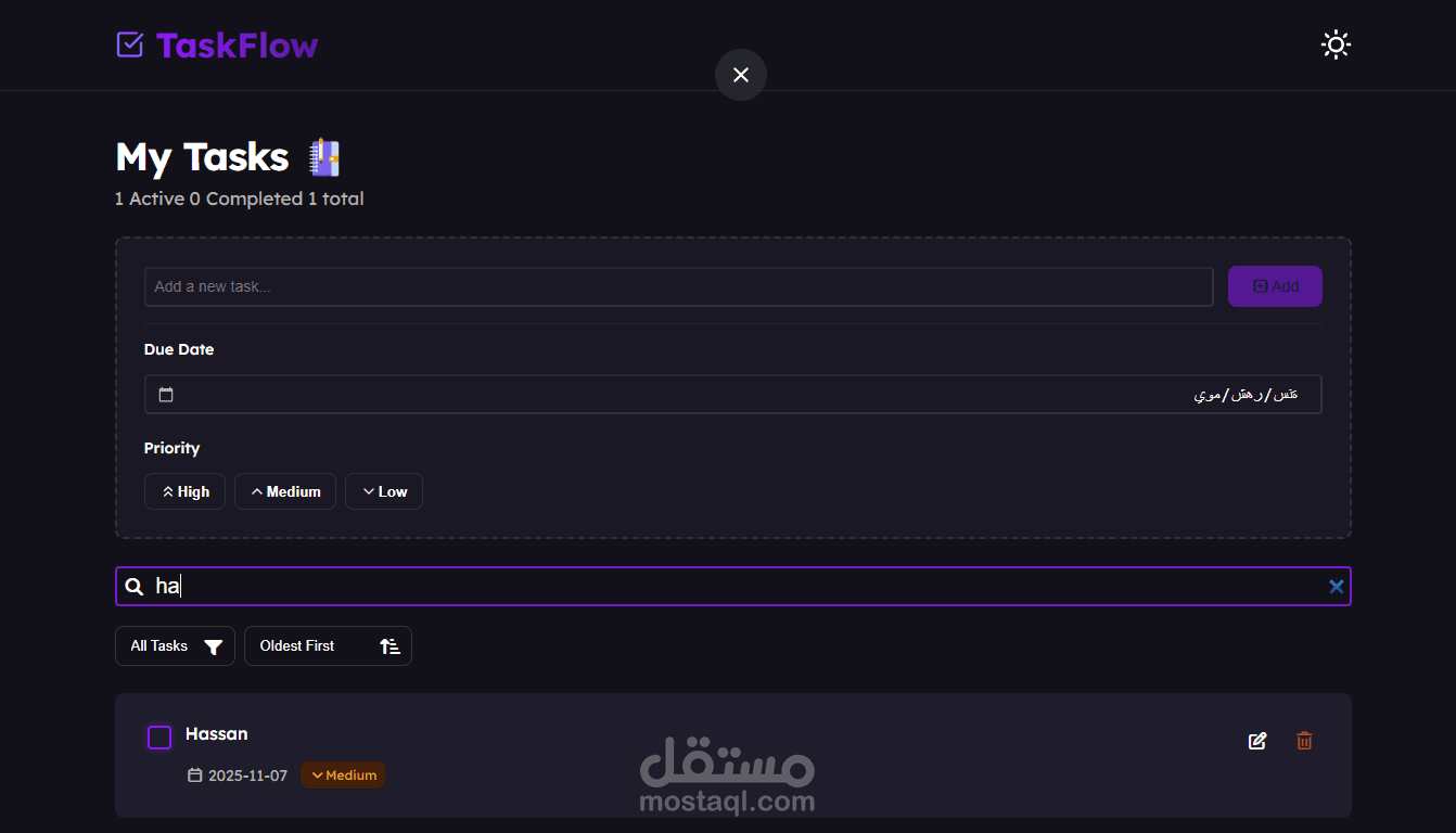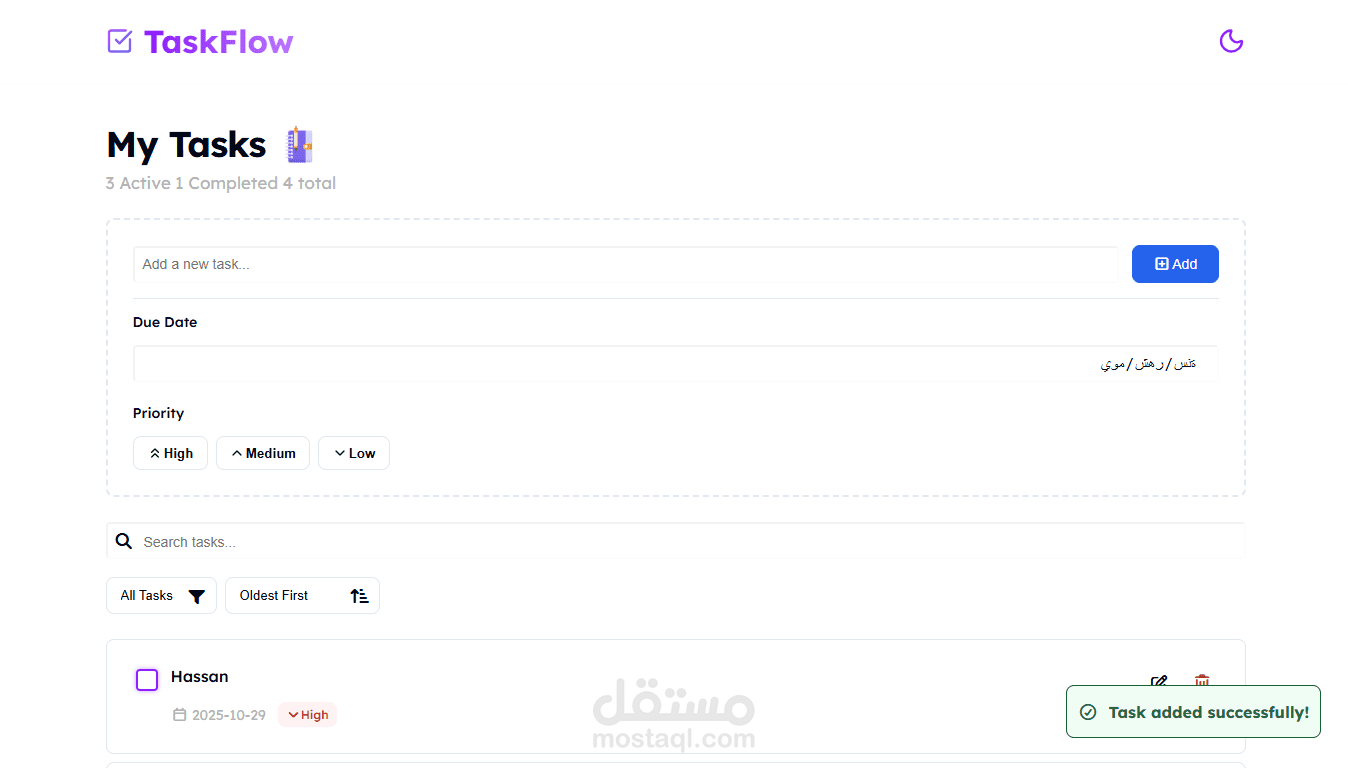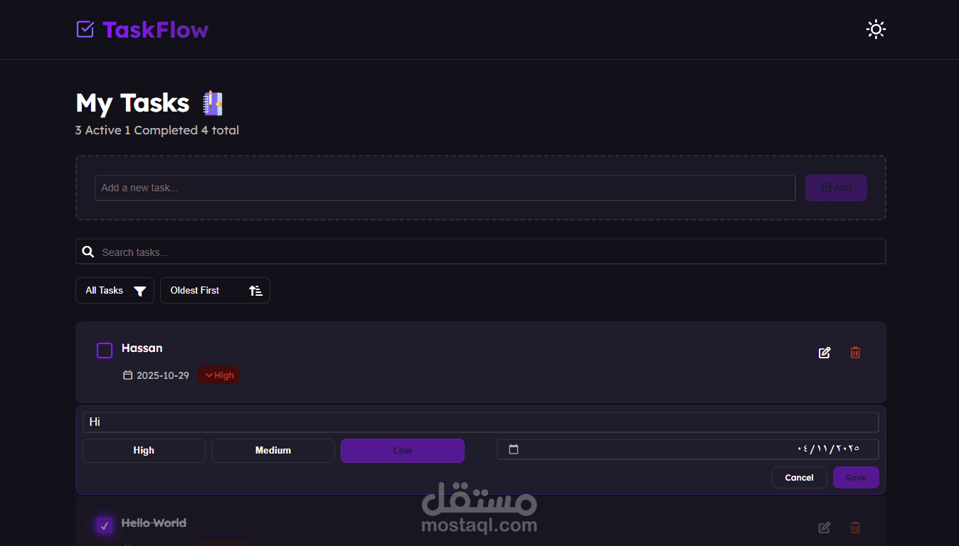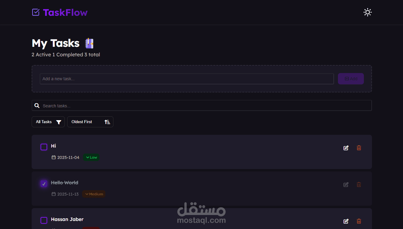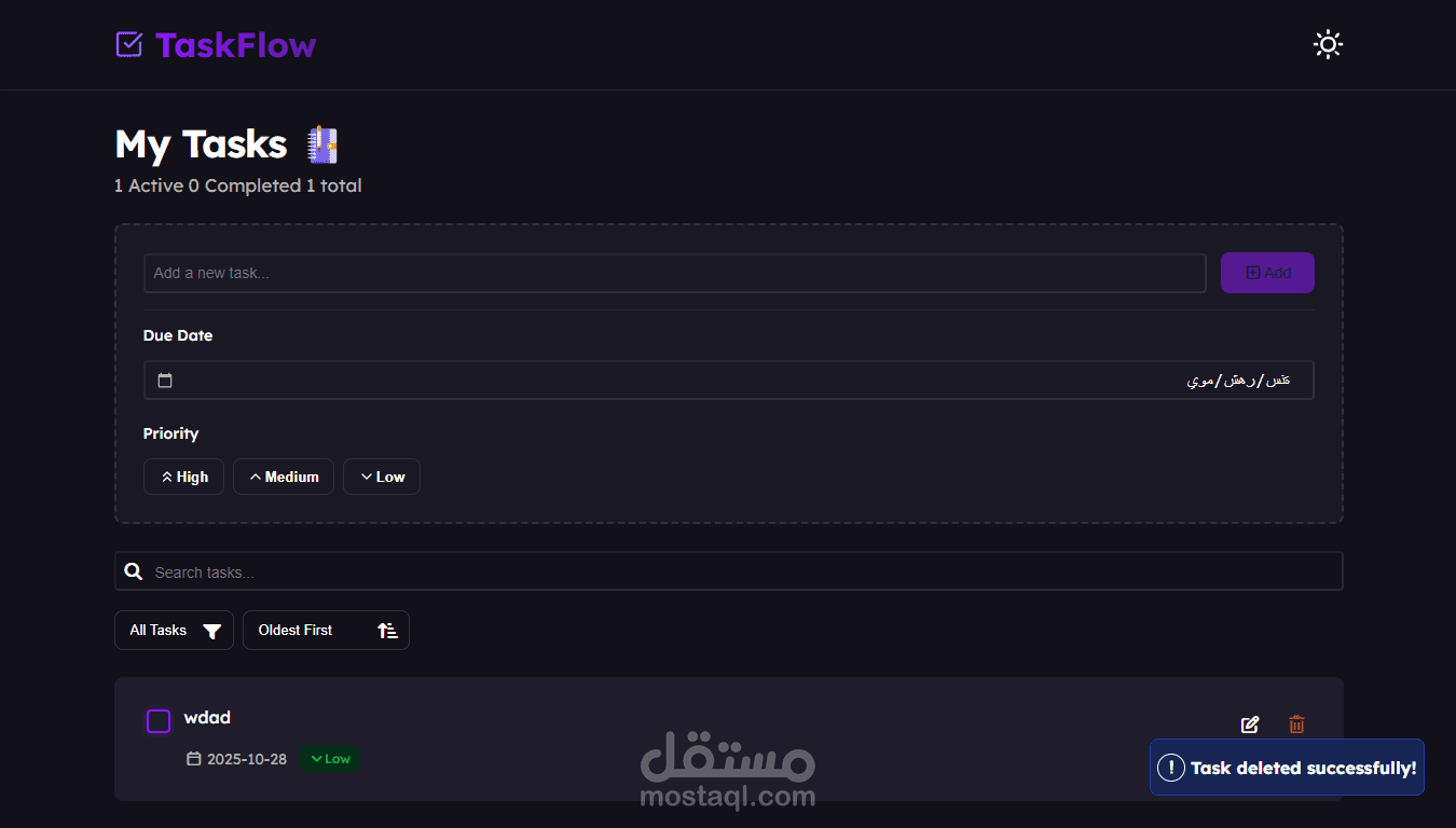 تطبيق To-Do List تفاعلي مبني باستخدام HTML, CSS, JavaScript يتيح للمستخدم: