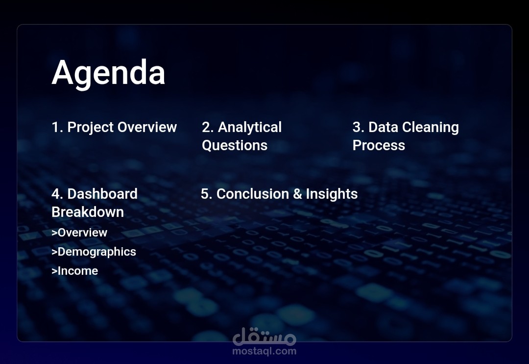 ترتيب منطقي للشرائح: مقدمة، فكرة المشروع، البيانات الأساسية، التحليل، النتائج، الخاتمة.
