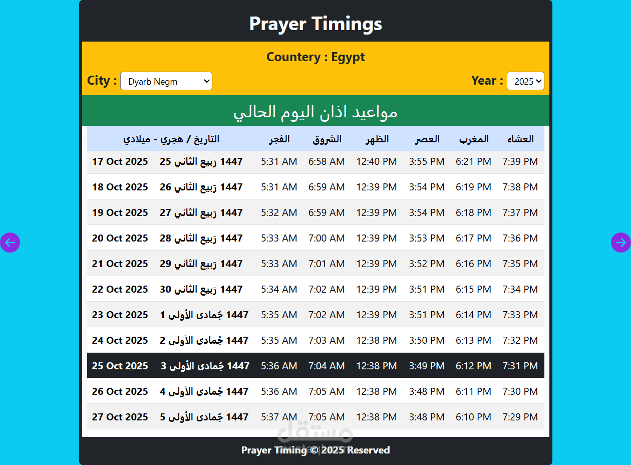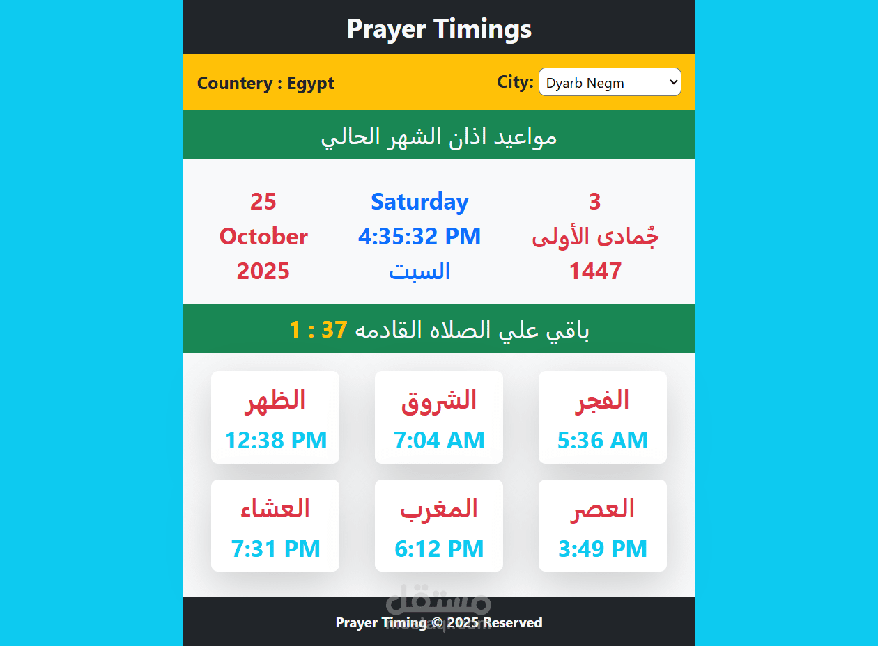 تطبيق ويب متخصص في عرض مواقيت الصلاة اليومية بدقة حسب موقع المستخدم، بالإضافة إلى تقويم هجري وميلادي كامل.