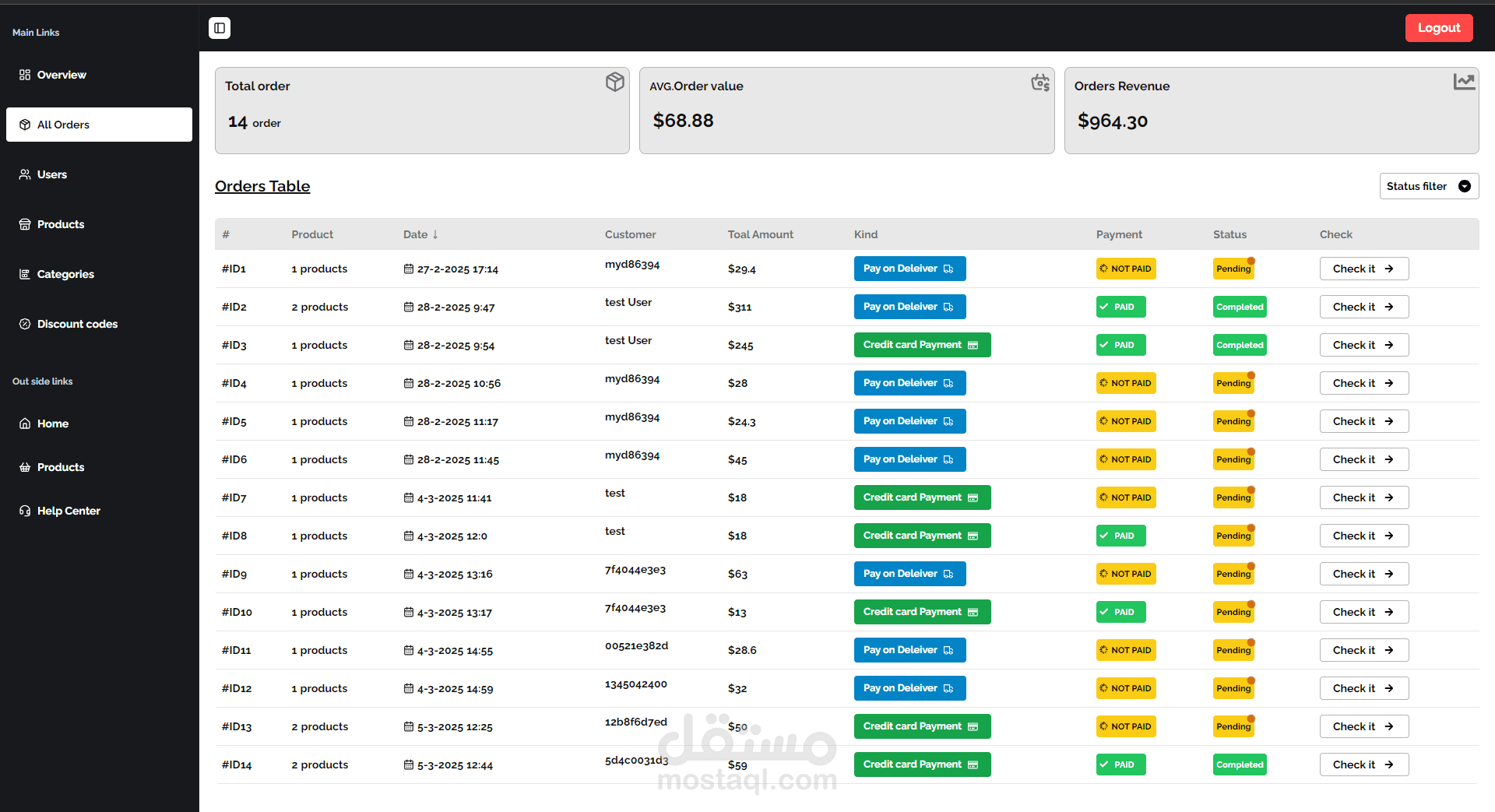 لوحة تحكم كاملة للإدارة (منتجات – فئات – طلبات)