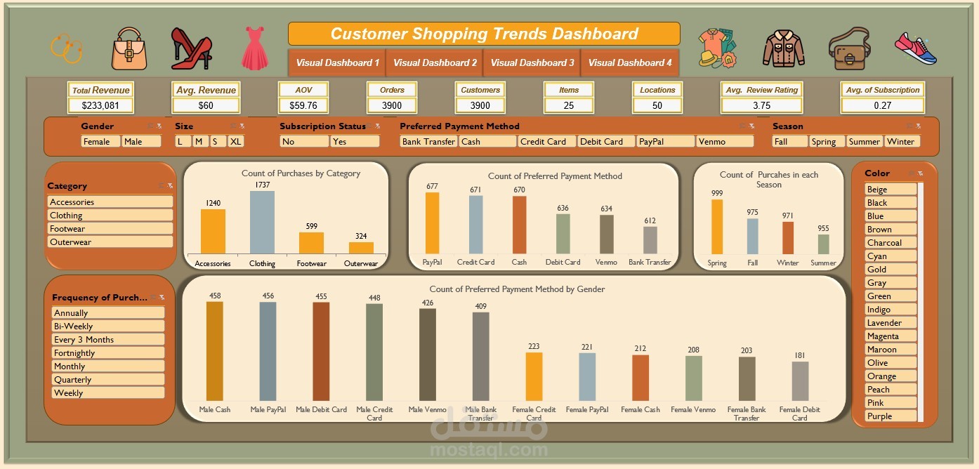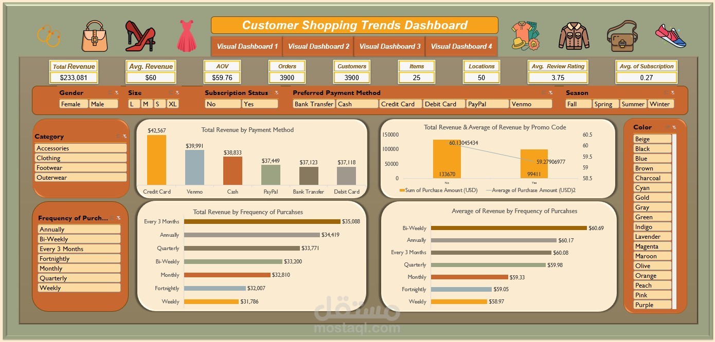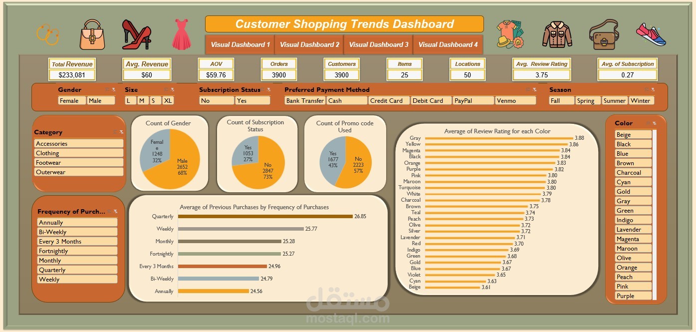 لوحة تفاعلية لدراسة سلوك العملاء اثناء التسوق Customer Shopping Trends تم تصميمها ببرنامج Excel