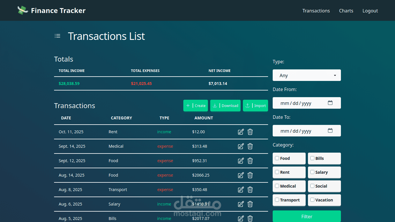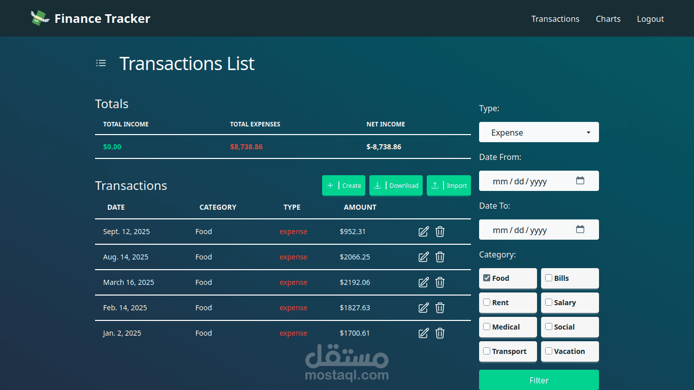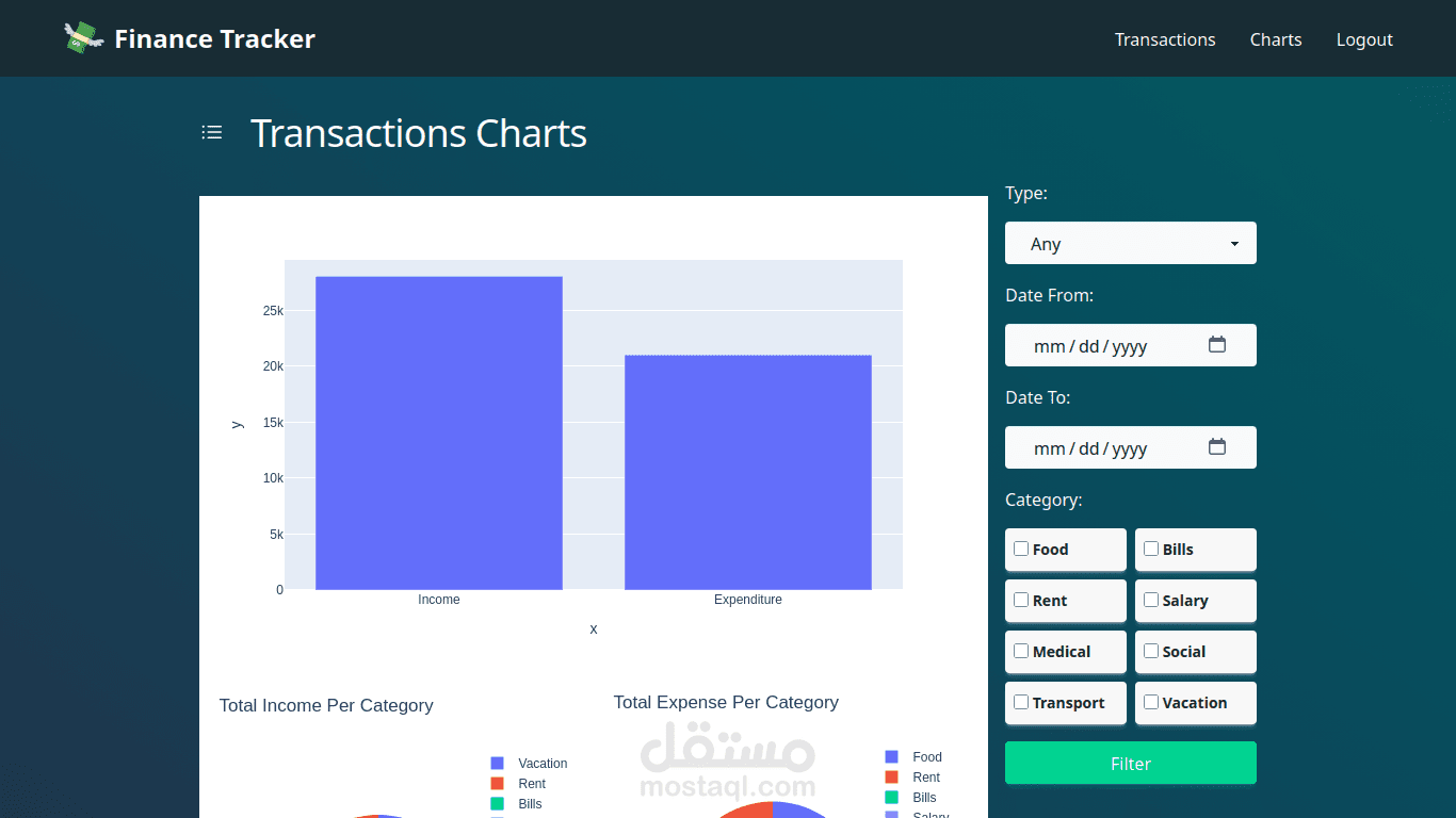 تطبيق متعدد المستخدمين لمتابعة المعاملات المالية كالصرف والدخل، مع إمكانية تصفيتها بحسب مصدر الدخل أو نوع الصرف، أو بحسب التاريخ، وميزة استيراد وتصدير البيانات في صورة ملف Excel أو csv، وكذلك عرضها في أشكال بيانية.