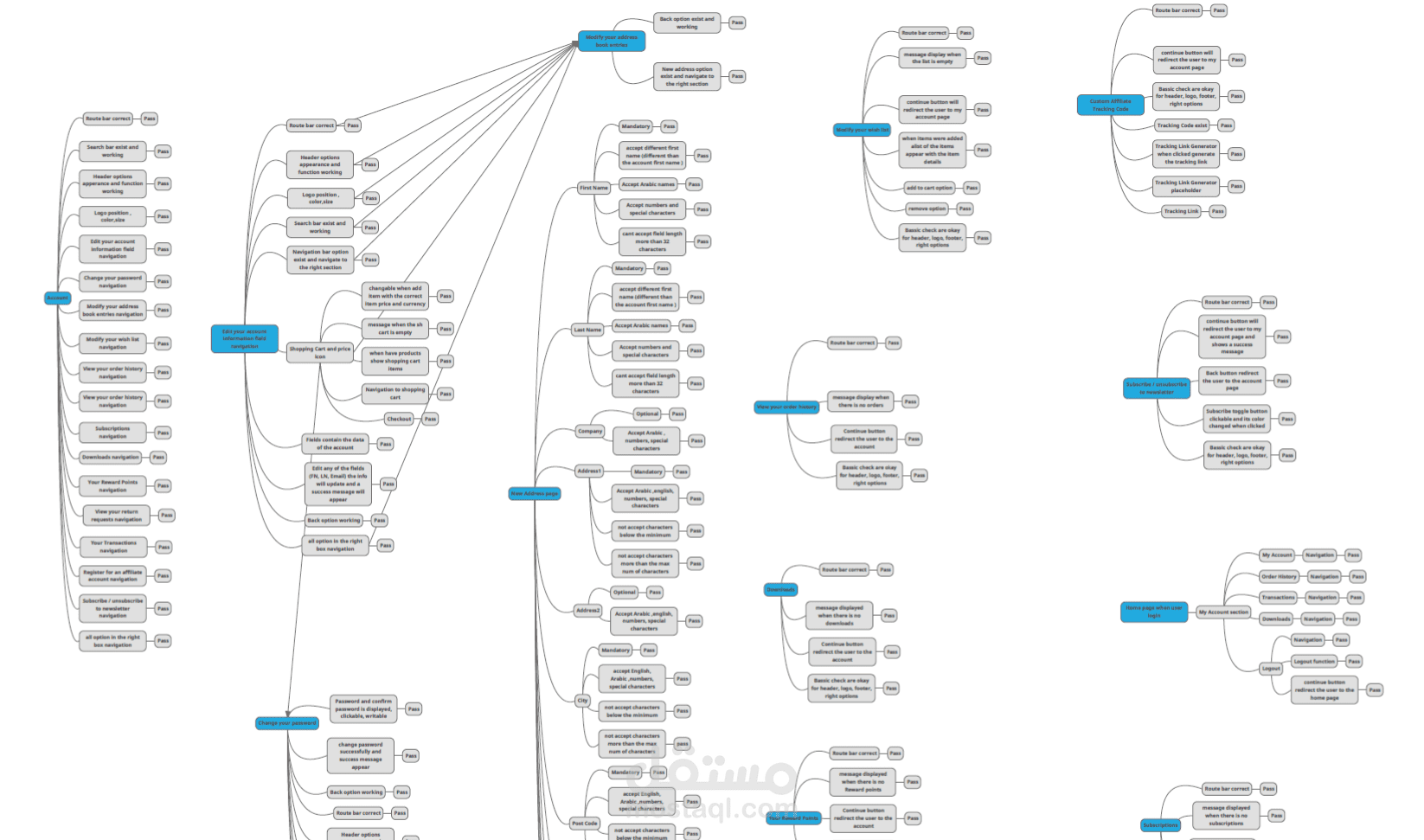تم إنشاء خريطة ذهنية لتصور هيكل الموقع وتحديد نطاق الاختبار (واجهة المتجر). كما تم تطوير مصفوفة تتبع حالات الاختبار (TCTM) لضمان تغطية منهجية وتنفيذ فعال للاختبارات.