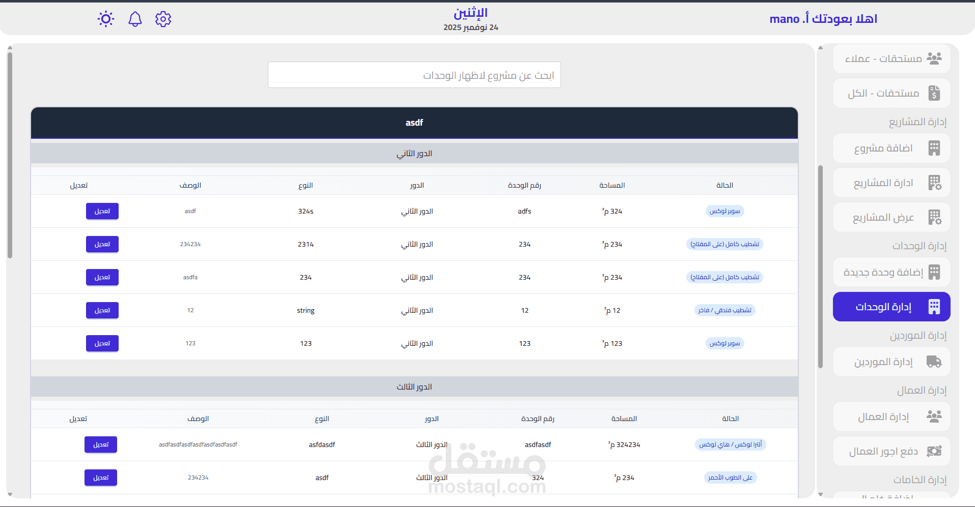 إدارة تفاصيل الوحدة (المساحة، الموقع، السعر)