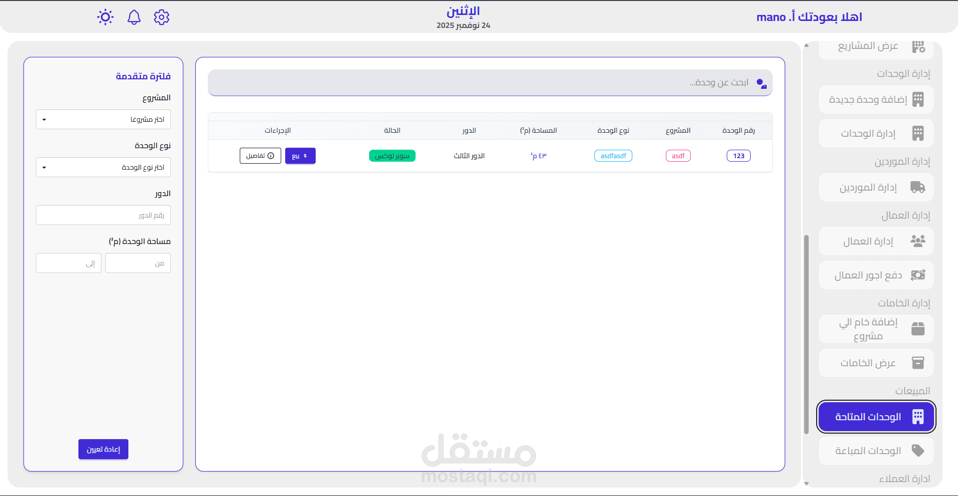 تتبع حالة الوحدات (متاحة، مباعة، قيد الإنشاء)