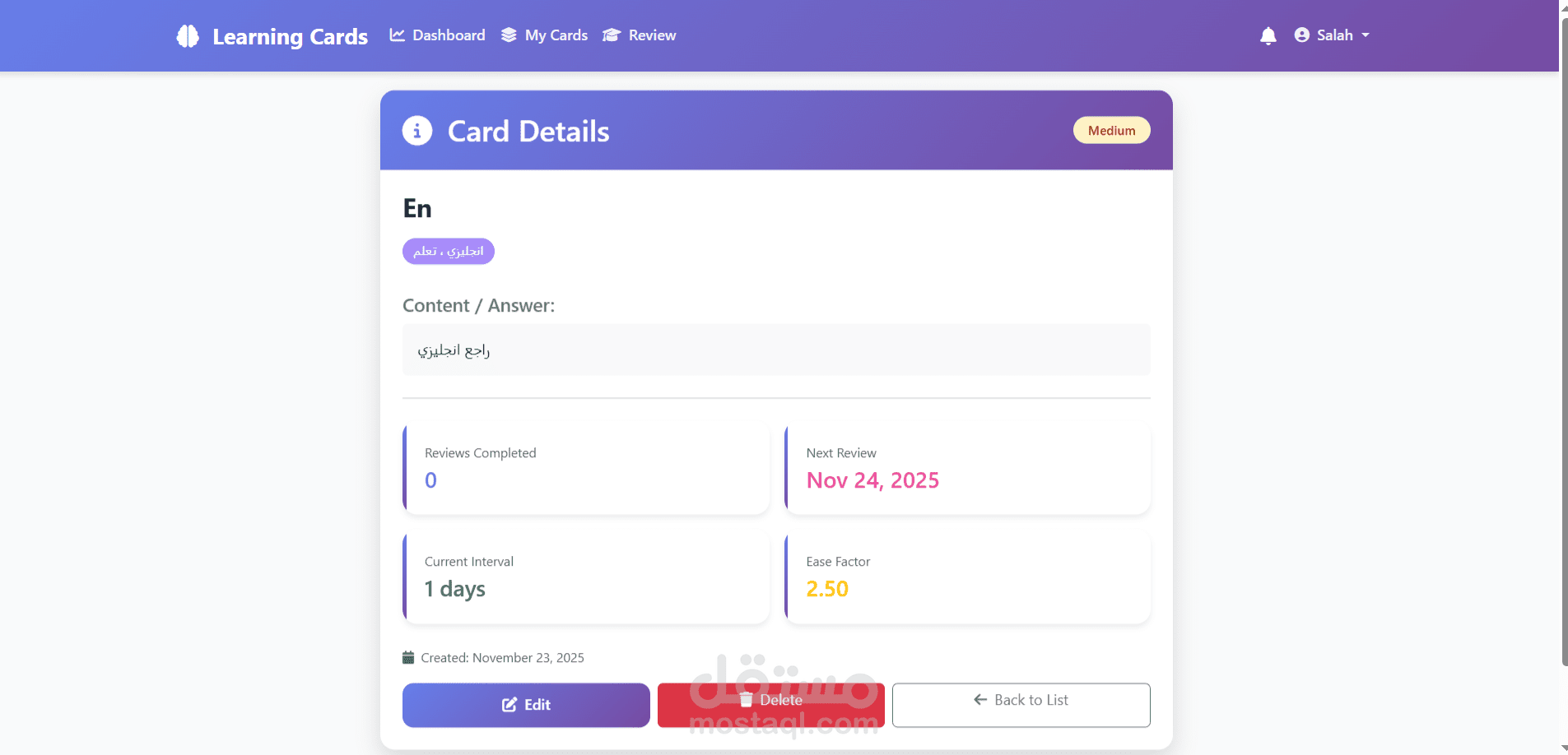 تطبيق ويب يساعد الطلاب على المذاكرة بذكاء من خلال بطاقات تعليمية يتم مراجعتها باستخدام تقنية التكرار المتباعد، لضمان حفظ أفضل وذاكرة أقوى على المدى الطويل.