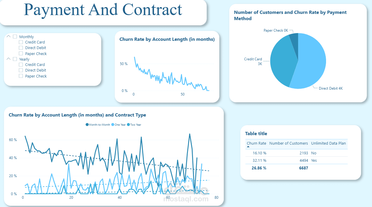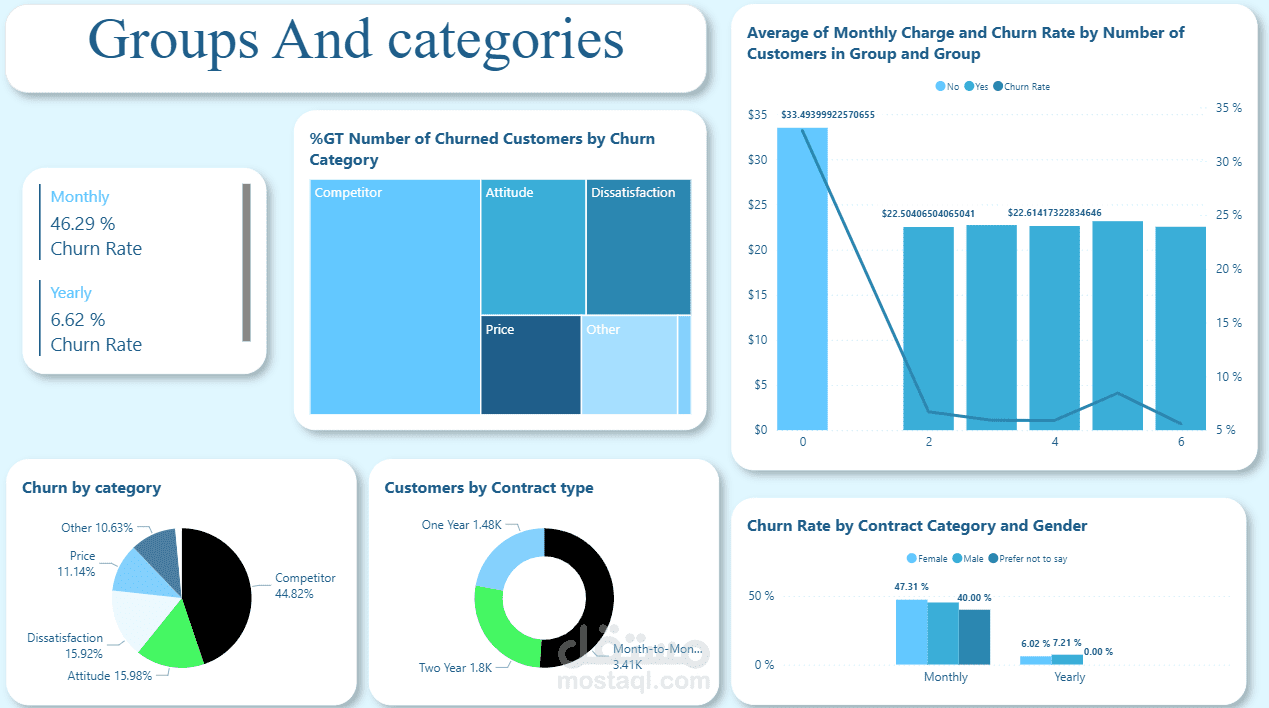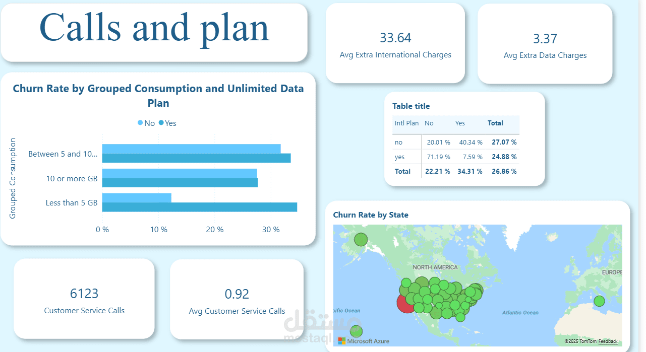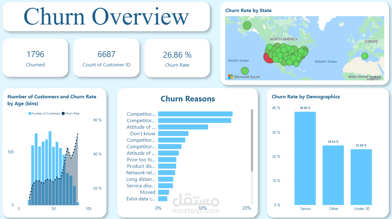 في هذا المشروع قمت ببناء لوحة معلومات تفاعلية باستخدام Power BI لتحليل بيانات العملاء وفهم العوامل التي تؤثر على قرارهم بترك الخدمة (Churn).