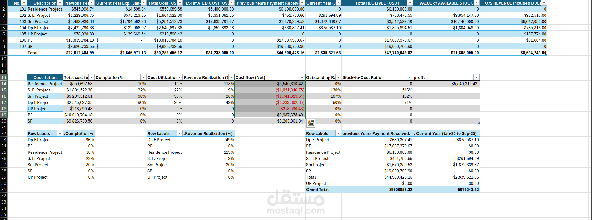 قمت بتصميم لوحة معلومات (Dashboard) احترافية باستخدام Excel لعرض وتحليل البيانات المالية الخاصة بعدة مشاريع في شكل بصري واضح ومنظم. تحتوي اللوحة على رسومات بيانية توضح المقارنات بين المصروفات السابقة والحالية، والإيرادات المستلمة، ونسب الإنجاز، بالإضافة إلى تحليل التكلفة التقديرية مقابل التكلفة الفعلية، والرصيد المتبقي لكل مشروع. تم إبراز أهم المؤشرات المالية مثل أعلى وأقل المشاريع من حيث الإنفاق أو الإيرادات، مع تصميم متناسق يسهل قراءة البيانات واتخاذ القرارات. هذا العمل يعكس مهارتي في تحليل البيانات وبناء لوحات معلومات احترافية في Excel تساعد في تبسيط المعلومات المالية وعرضها بطريقة عملية وجذابة.