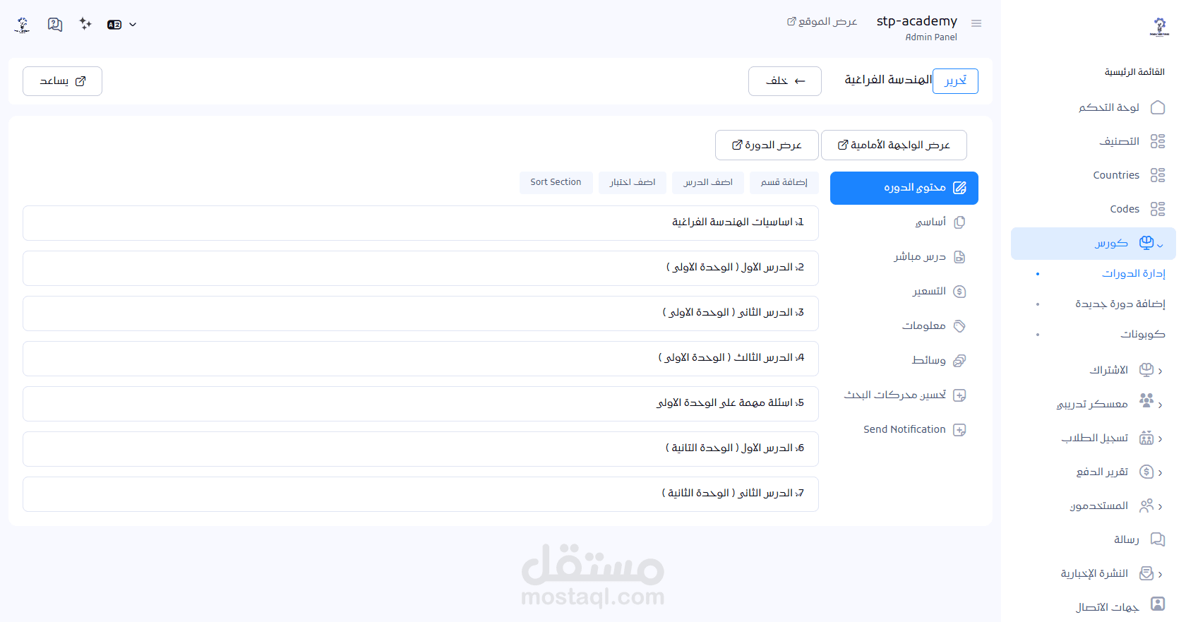 تنظيم المحتوى داخل وحدات ودروس مع التحكم في الترتيب.