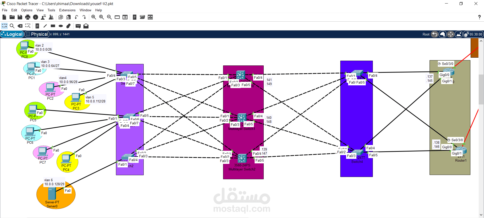 يظهر المشروع في الصورة توبولوجي شامل يحتوي على عدة Layers من السويتشات، وراوترات مترابطة ببروتوكولات توجيه، بالإضافة إلى تقسيم الشبكة إلى VLANs متعددة لكل قسم داخل المؤسسة.