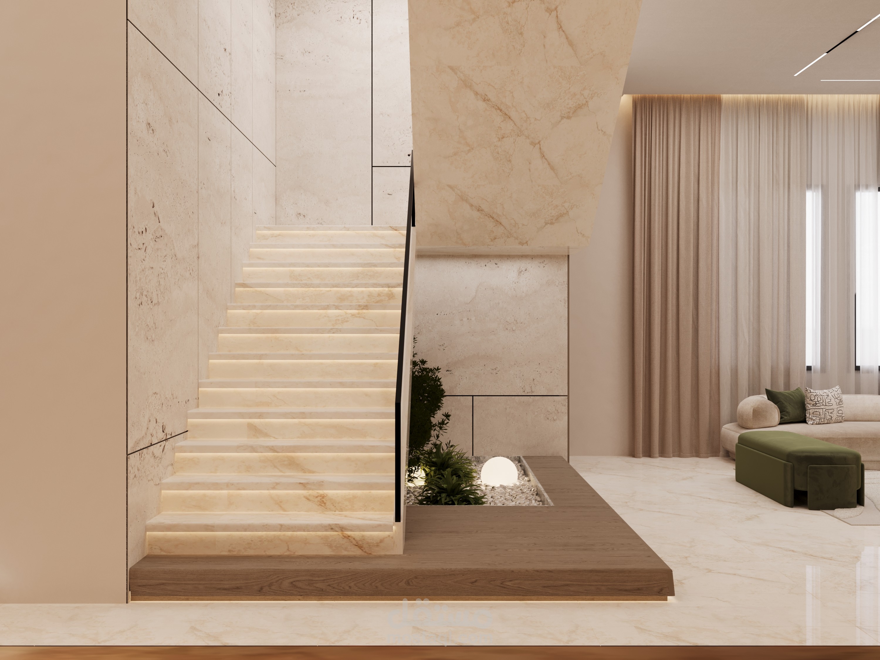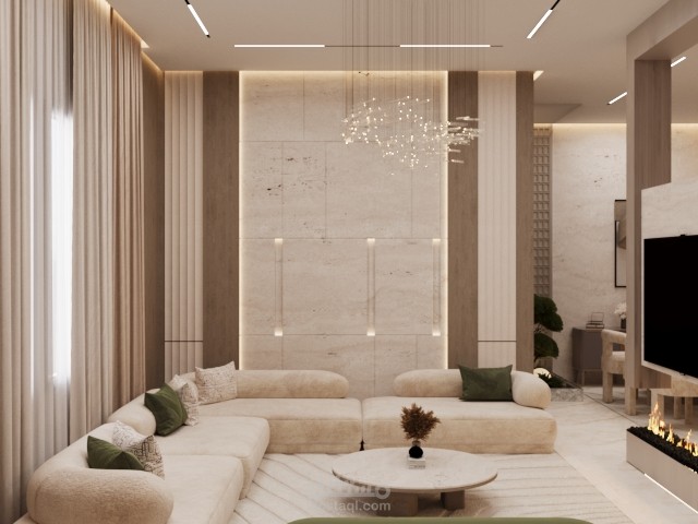 The living area features contemporary furniture with sleek silhouettes and comfortable upholstery, arranged to encourage relaxation and smooth circulation. Natural light floods the room through large windows, enhancing the sense of openness, while accent lighting and hidden LED strips add warmth and depth during the evening hours. Minimalist décor, curated artwork, and subtle greenery give the space character without compromising its modern simplicity.