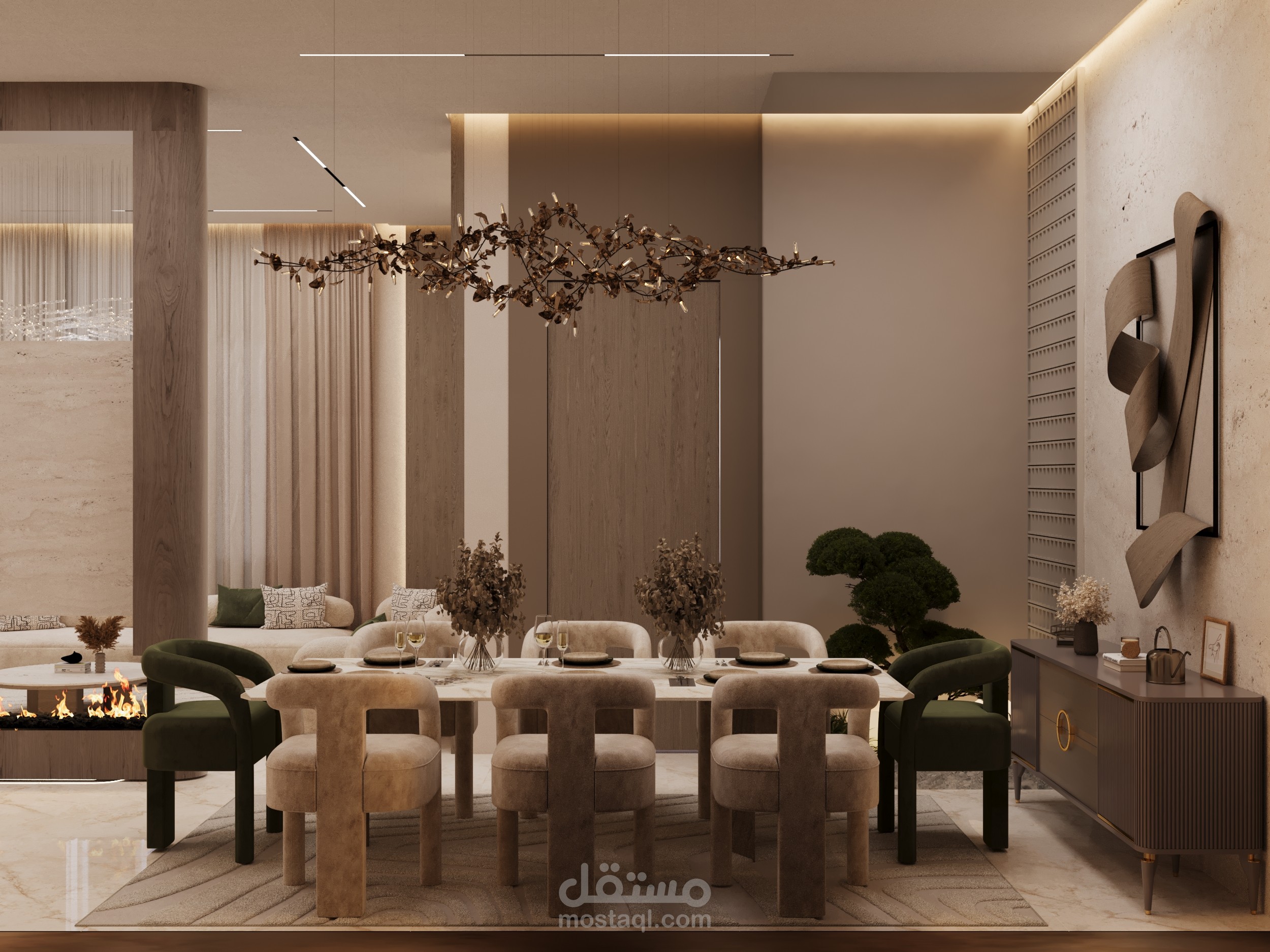 This modern open-concept living and dining area presents a seamless blend of elegance, simplicity, and functionality.