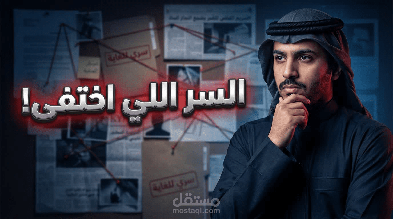 يعتمد المشروع على ألوان تحقيقية داكنة مثل الأزرق الغامق والأحمر، مع عناوين عربية ثلاثية الأبعاد قوية وجذّابة تلفت النظر من أول لحظة.