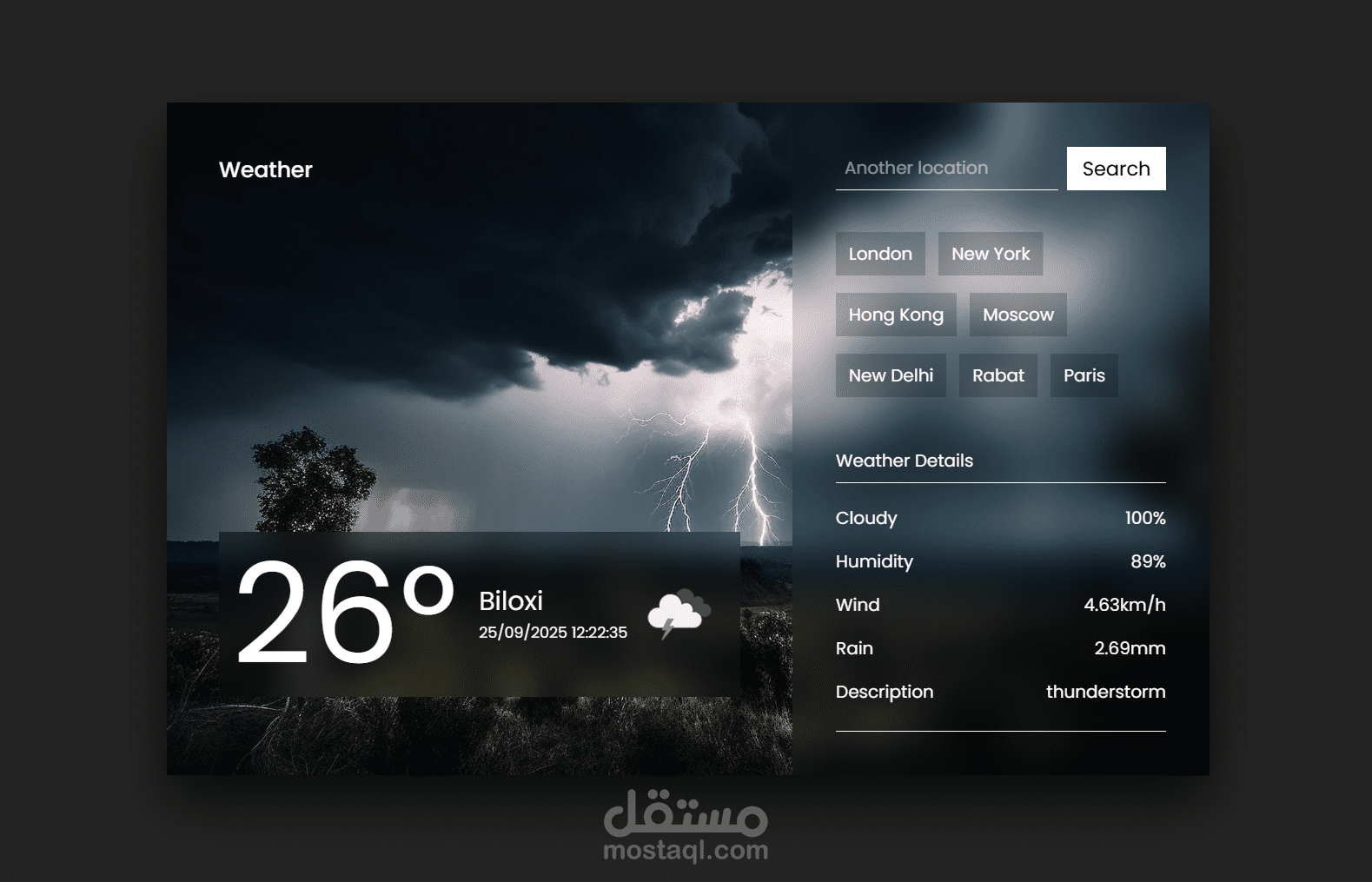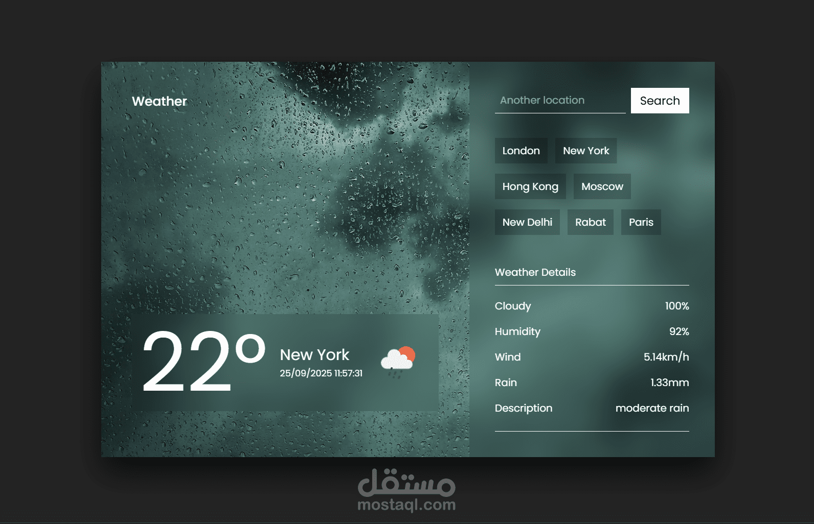 تطبيق طقس متجاوب تم تطويره باستخدام React وVite وTailwind CSS. يمكن للمستخدمين البحث عن معلومات الطقس حسب المدينة أو استخدام موقعهم الحالي للحصول على تحديثات الطقس المباشرة.
