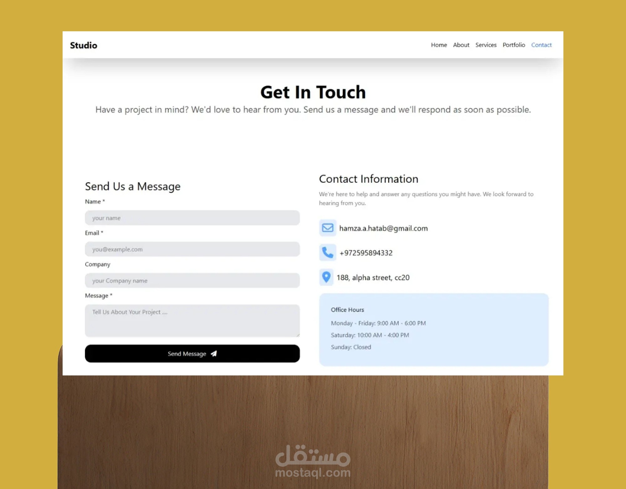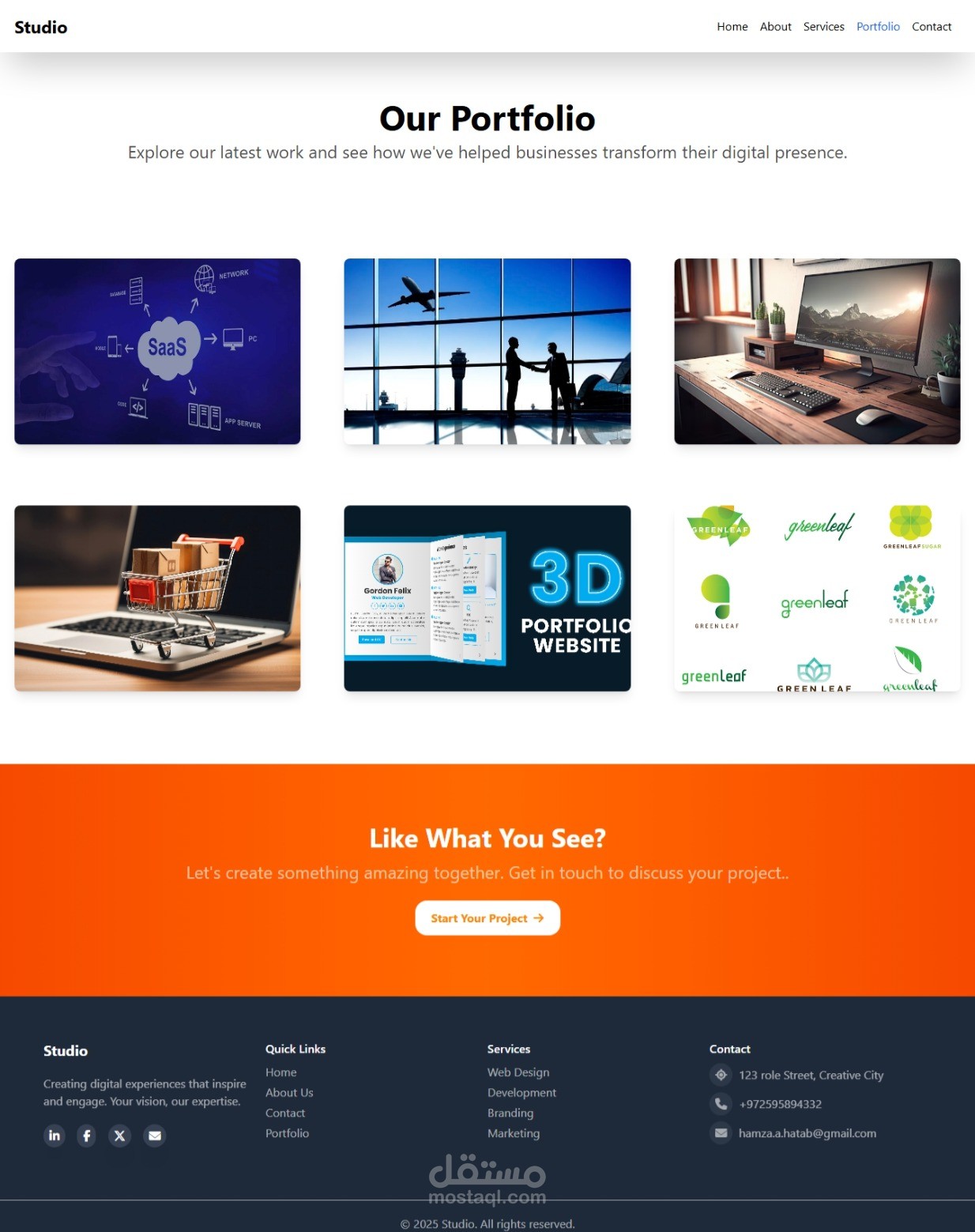 معرض الأعمال (Portfolio): يعرض المشاريع السابقة بتصميم شبكي أنيق.