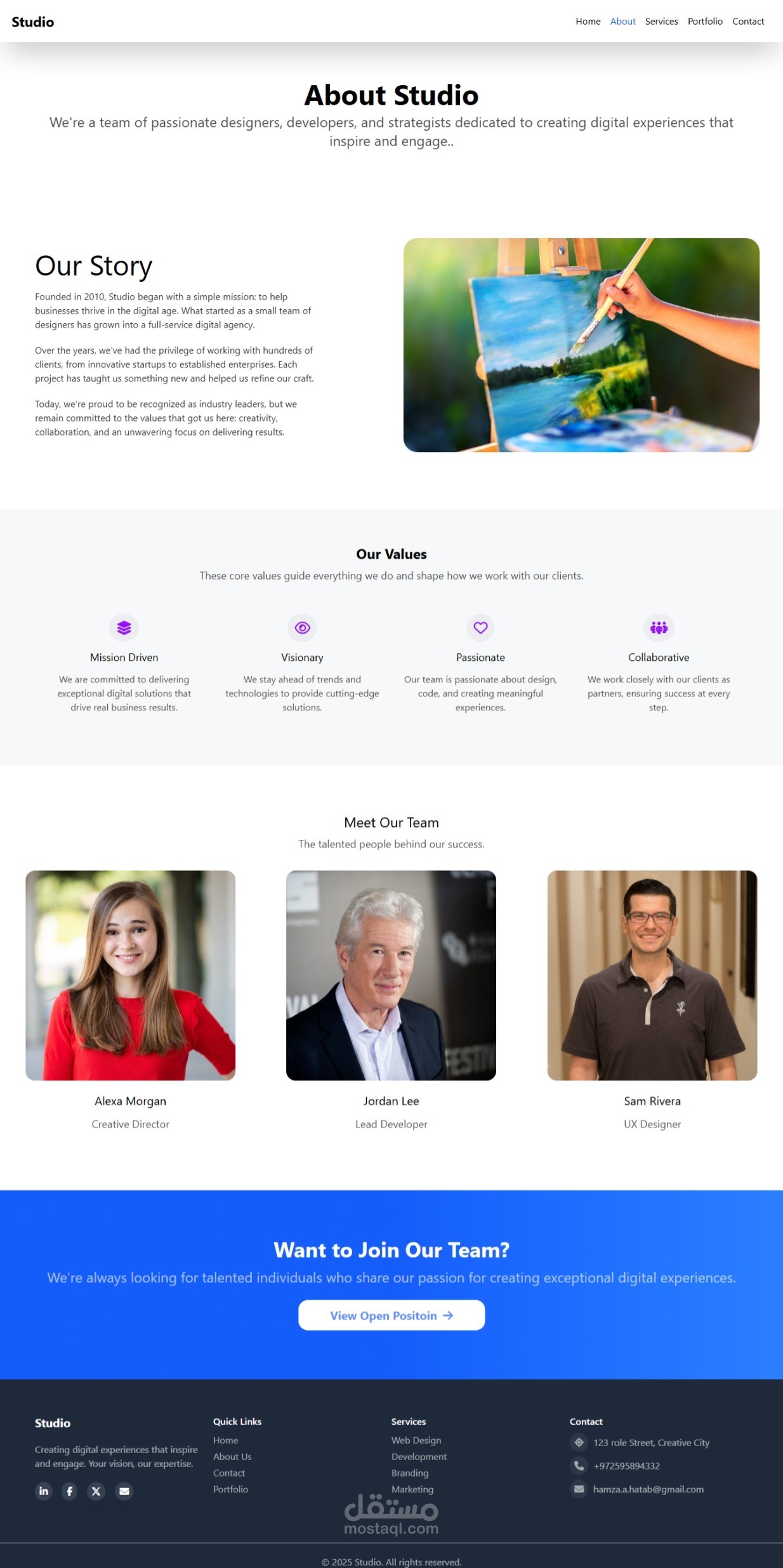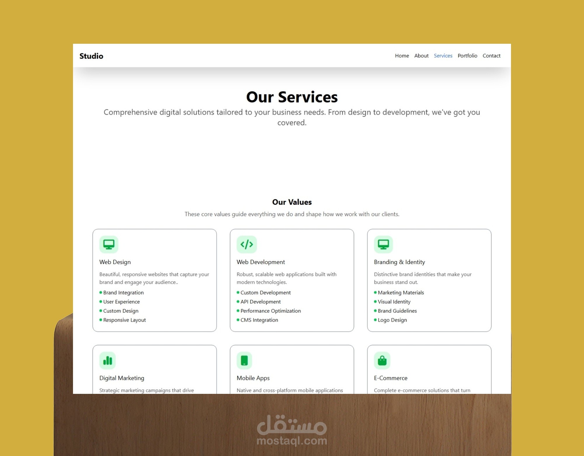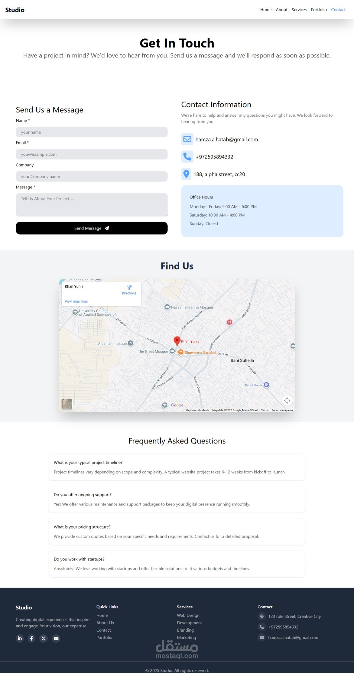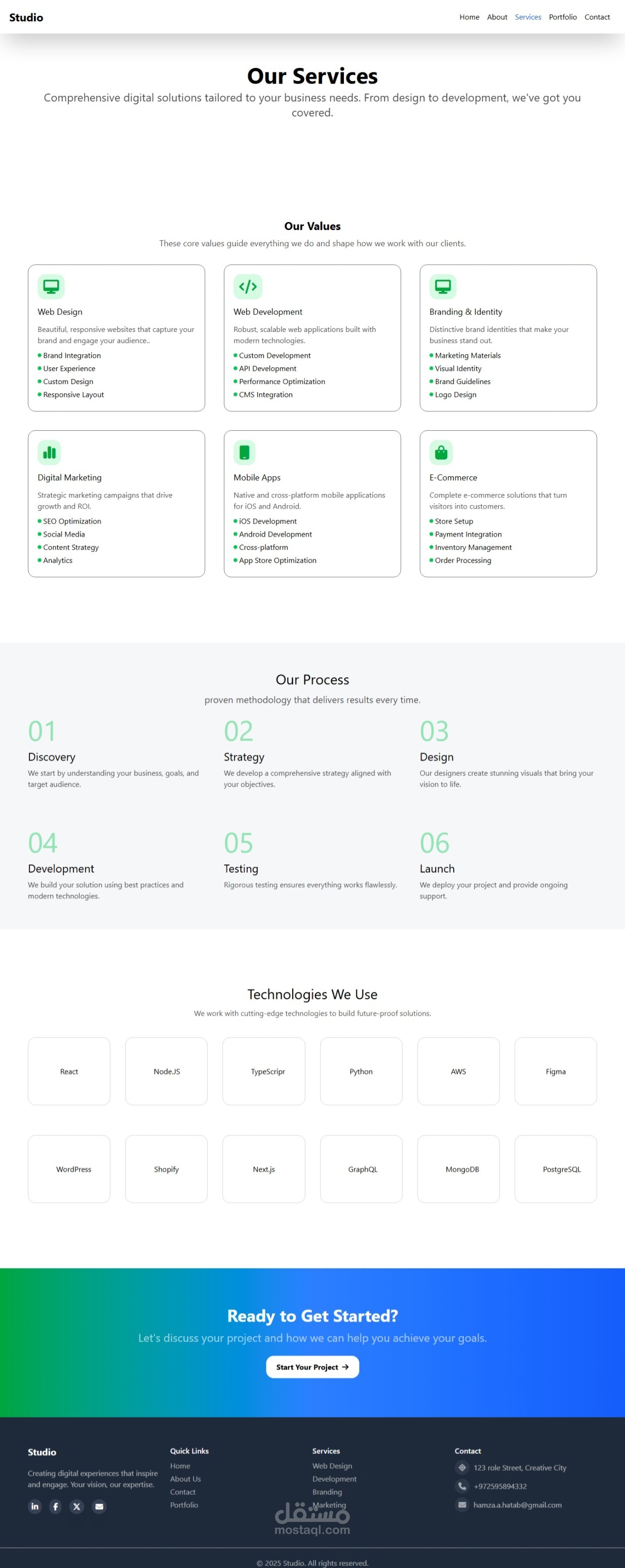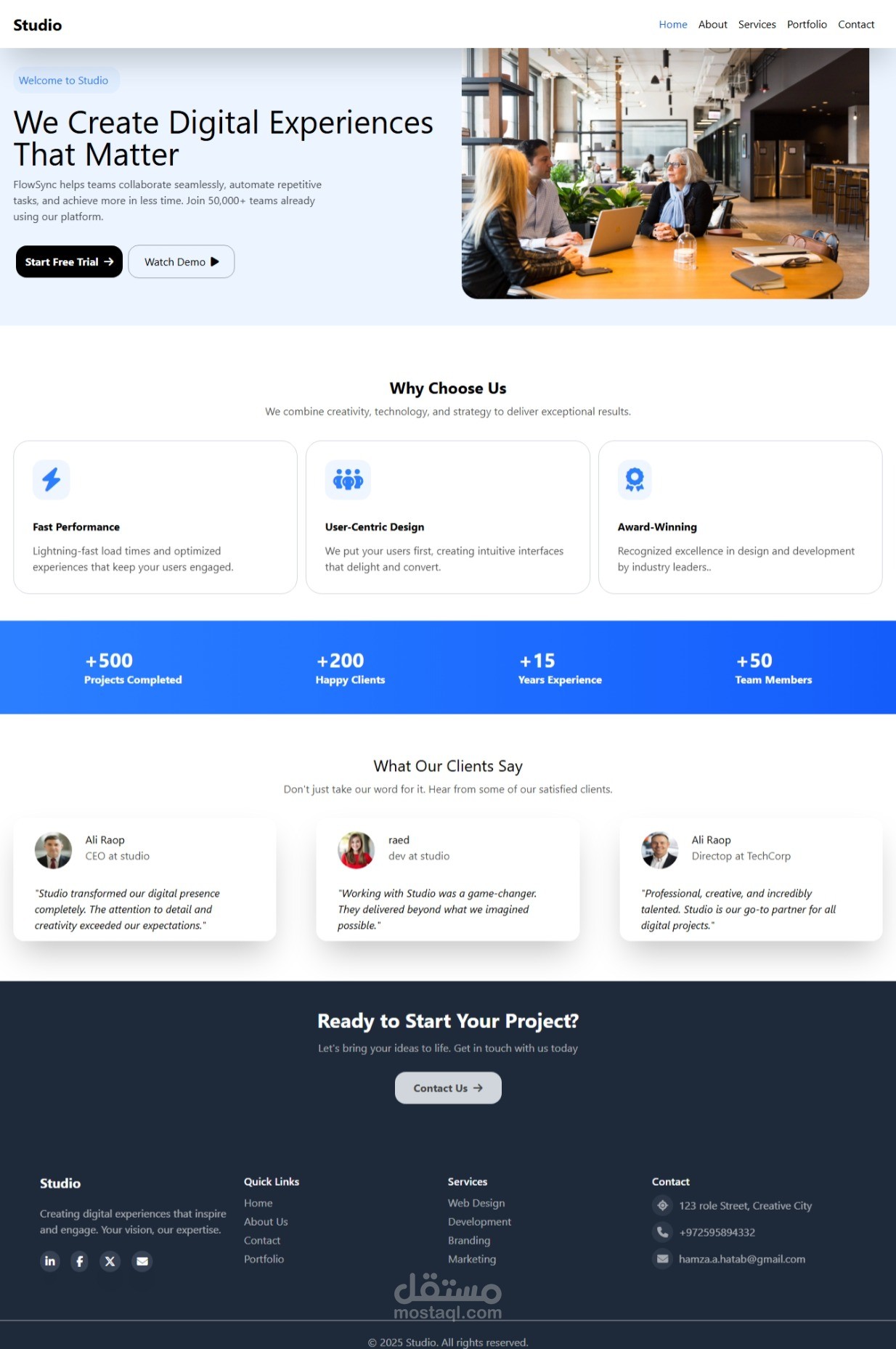 قمت بتطوير موقع ويب متكامل ومتعدد الصفحات لوكالة تصميم أو استوديو إبداعي (Studio)، يهدف إلى عرض الخدمات، معرض الأعمال، وشهادات العملاء بطريقة احترافية وجذابة. هذا المشروع يمثل تطبيقًا عمليًا لمهاراتي في بناء واجهات المستخدم (Frontend) المعقدة والمتجاوبة.