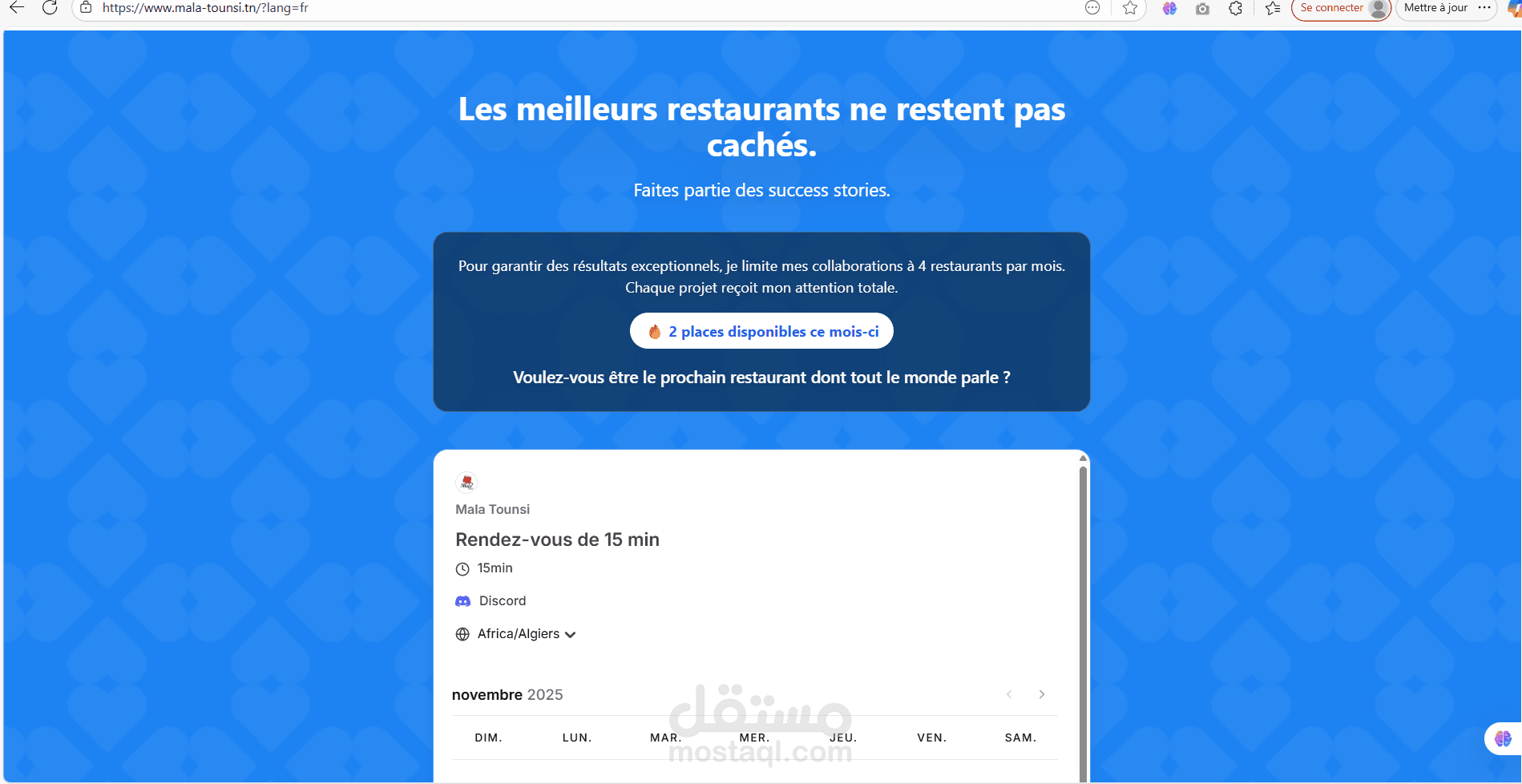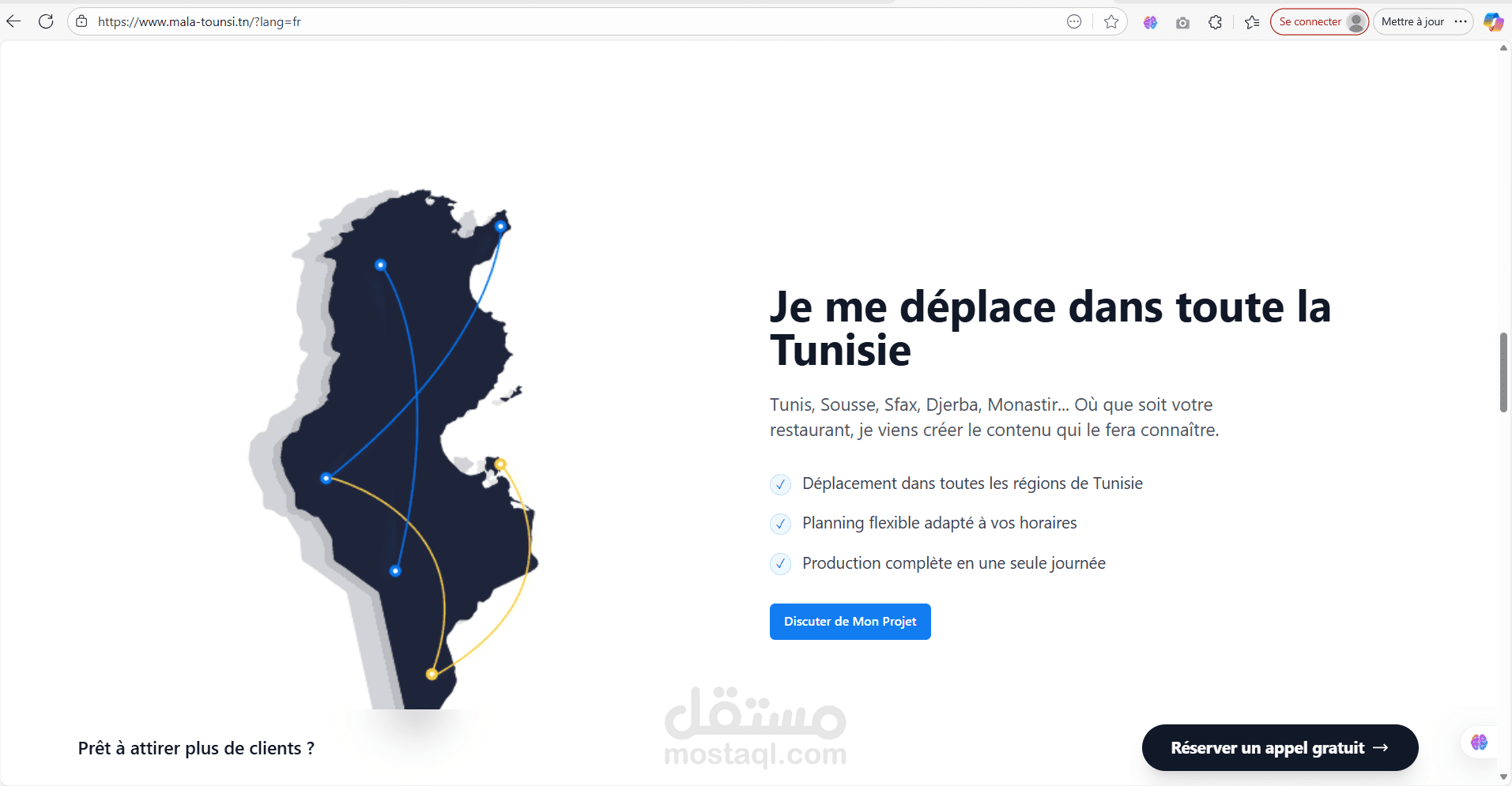 تم تنفيذ هذا المشروع لصالح Mala Tounsi وهو موقع إلكتروني تونسي متخصص في عرض وبيع المنتجات بطريقة عصرية وسهلة، مع التركيز على إبراز الهوية المحلية وتجربة المستخدم السلسة.