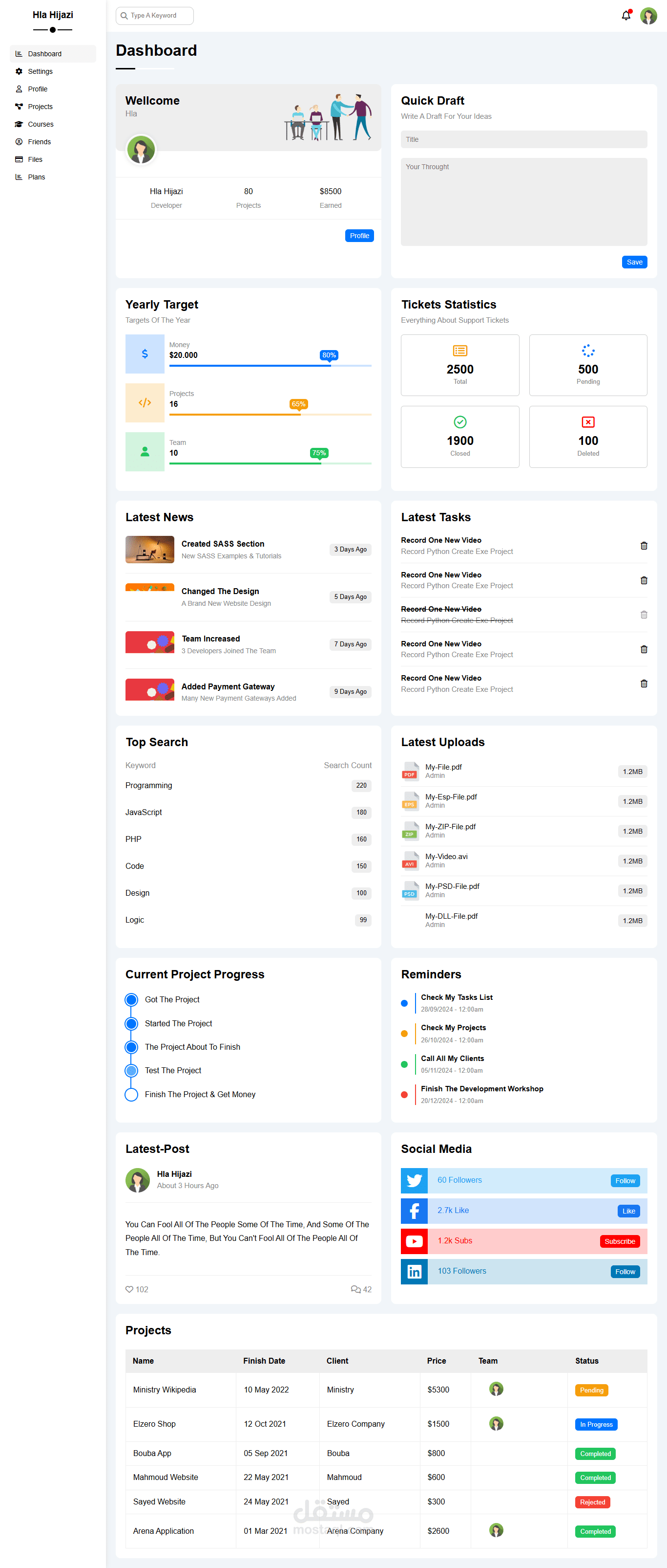 لوحة تحكم (Dashboard) احترافية تم تطويرها باستخدام HTML, CSS، بتصميم متجاوب ومقسم بذكاء لعرض بيانات المستخدم، الإحصائيات، المهام، التذاكر، الملفات، والتقدم بالمشاريع.