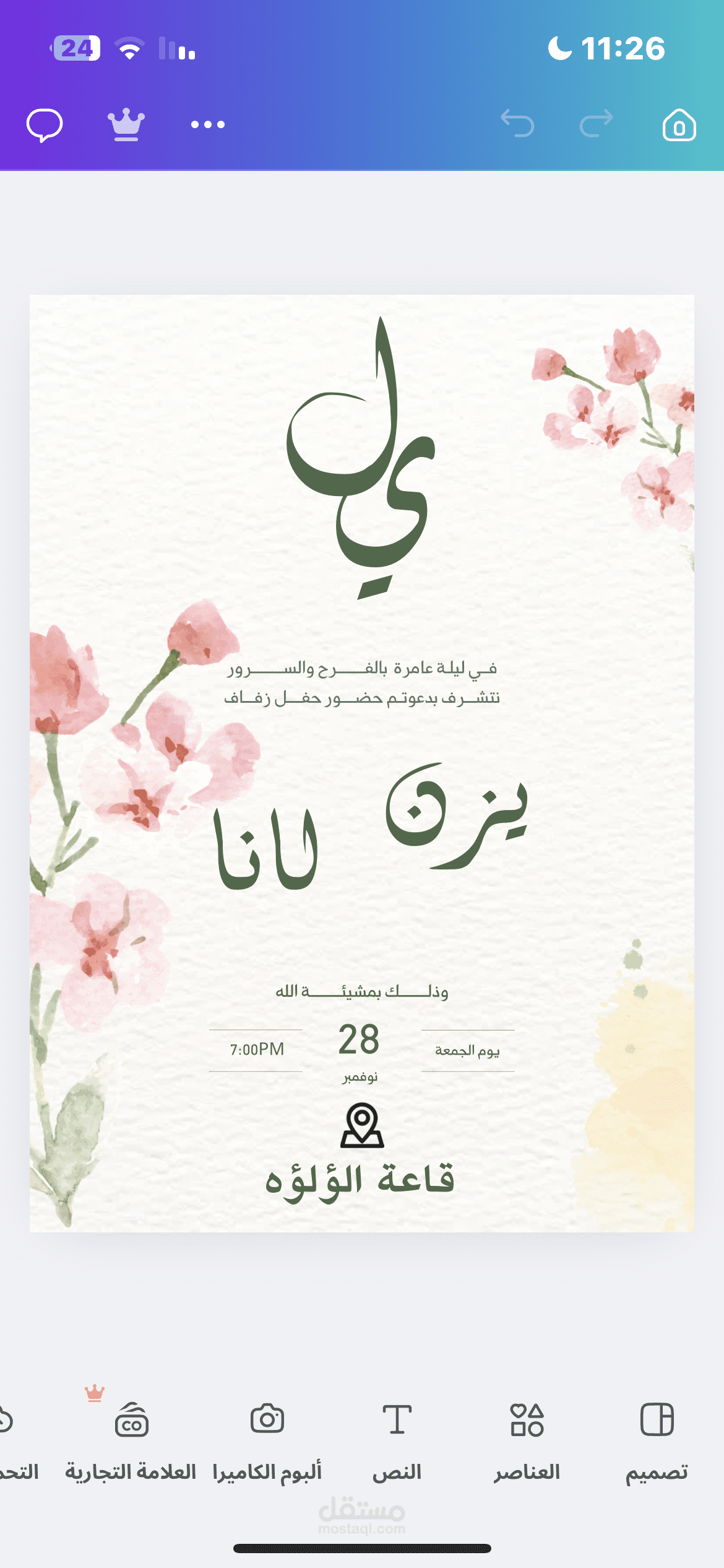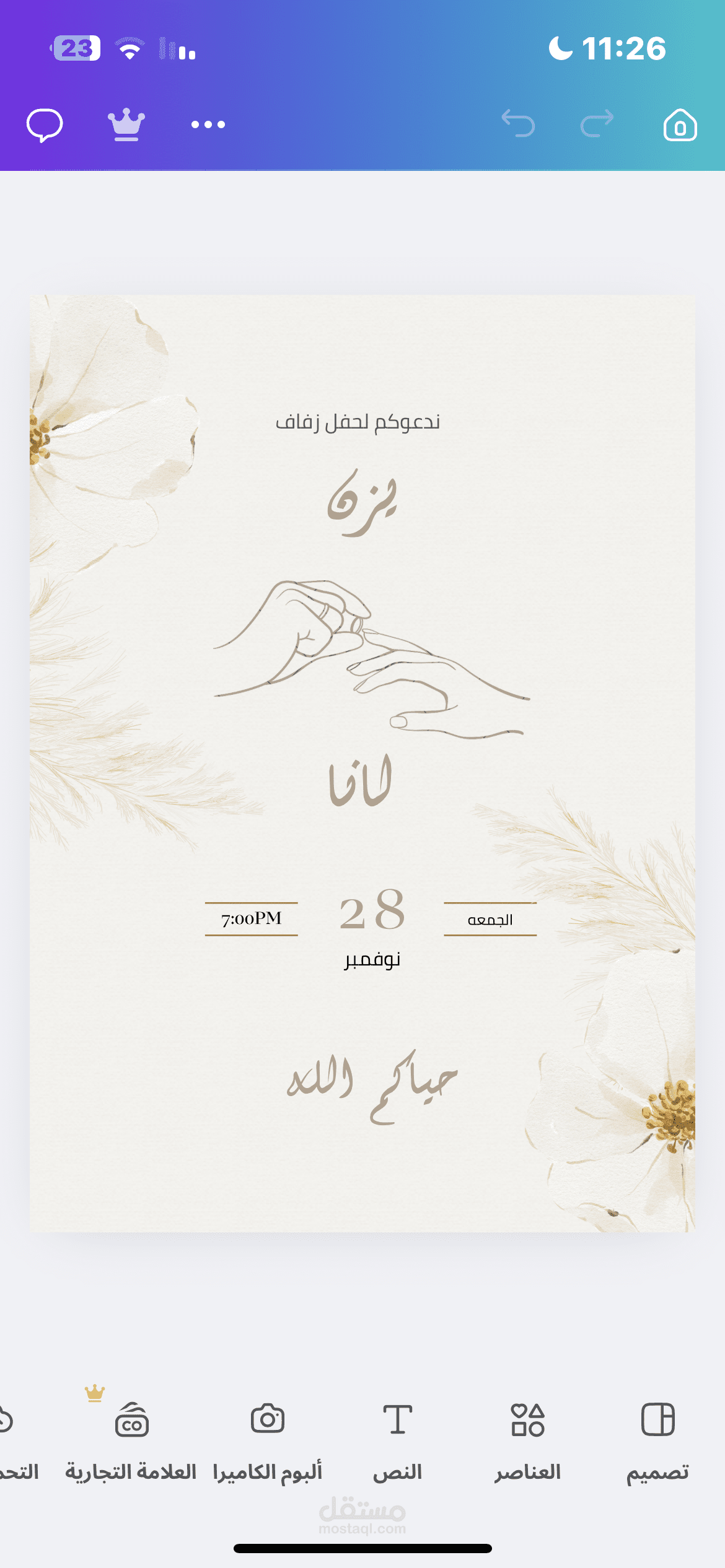 • تحديد المناسبة: يجب تحديد إذا ما كانت الدعوة لحفل عقد القِران، أو حفل الزفاف، أو حفلة الاستقبال.