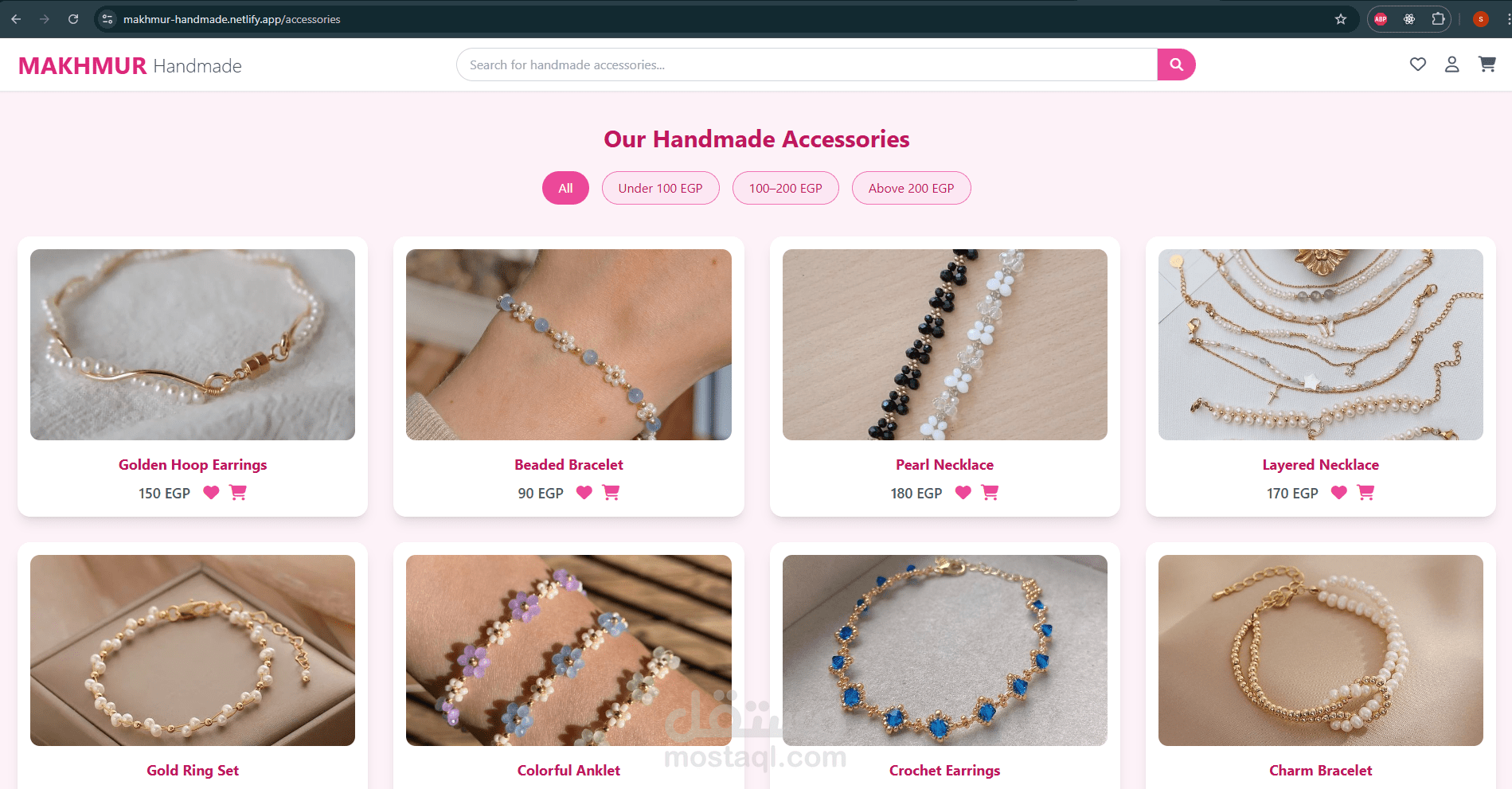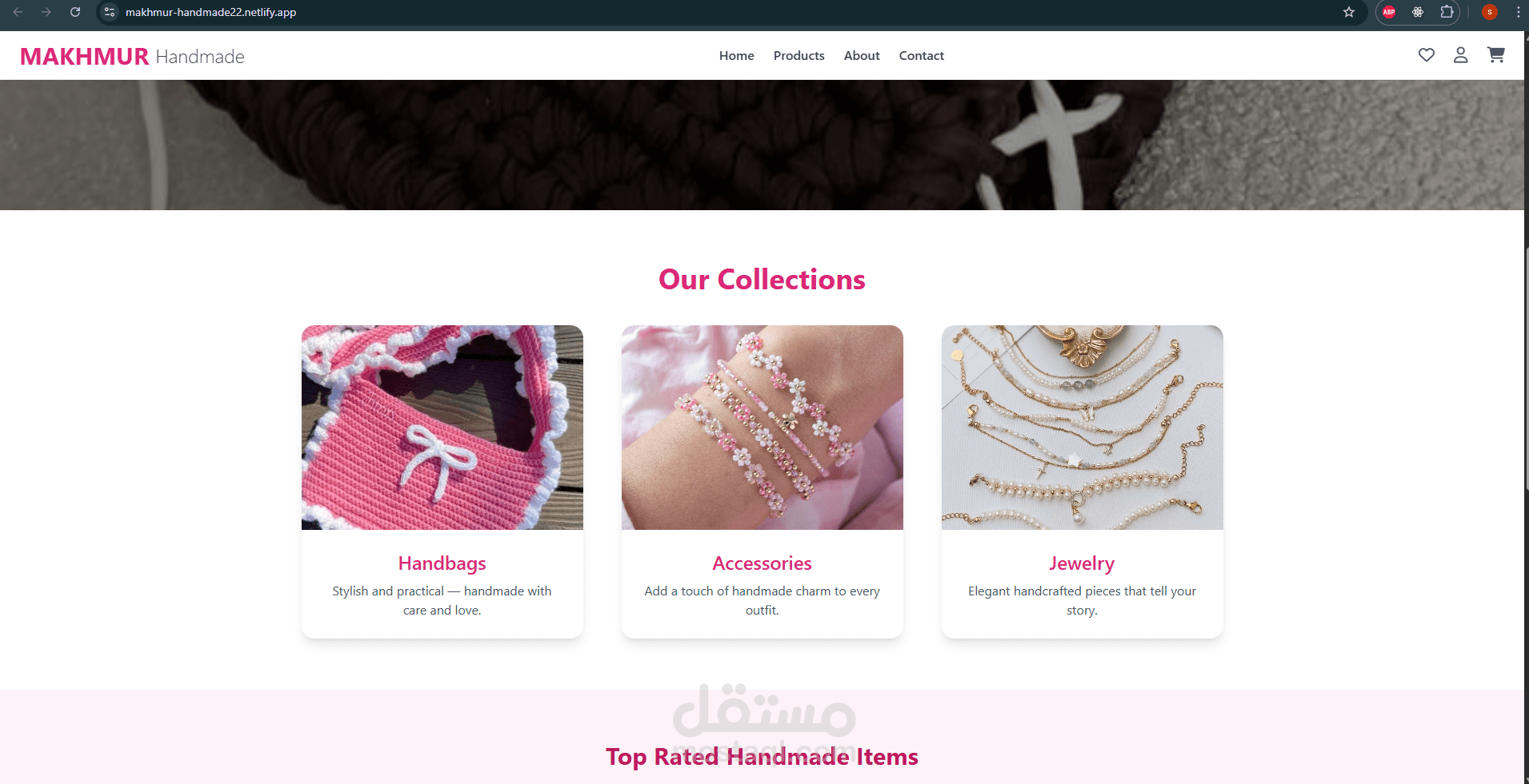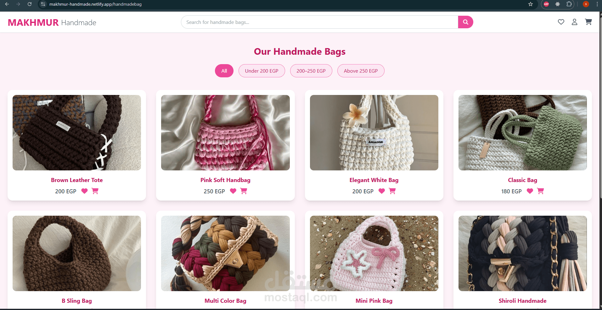 مشروع متجر إلكتروني لشنط وإكسسوارات هاند ميد تم تطويره باستخدام HTML, Tailwind CSS, وJavaScript.