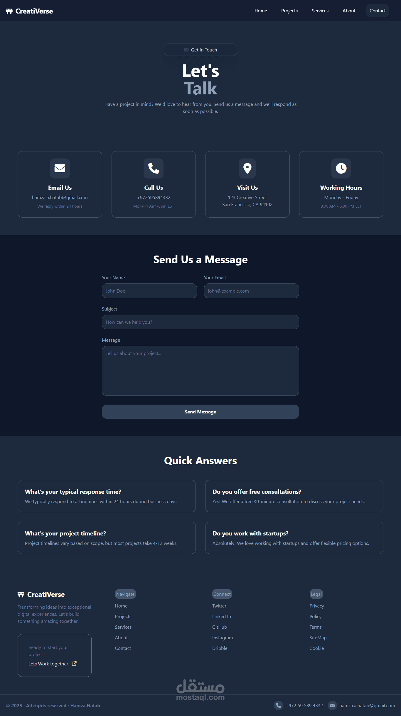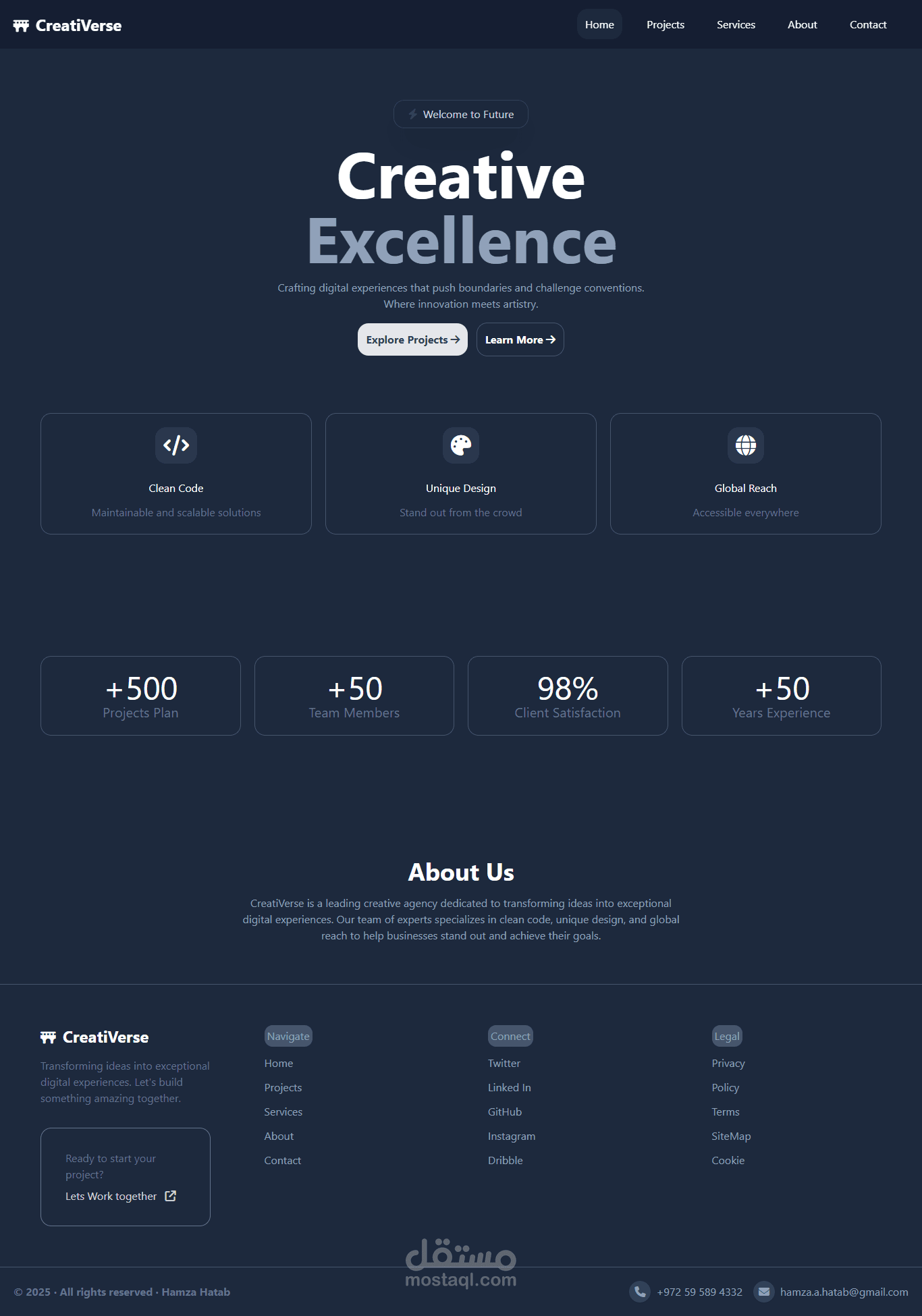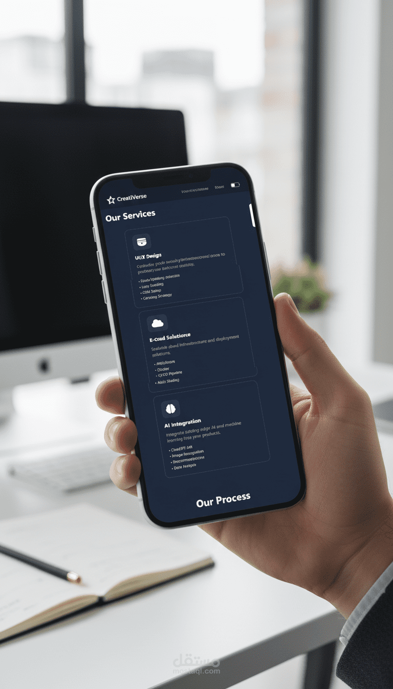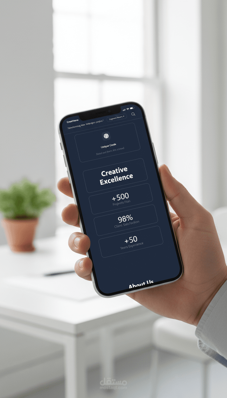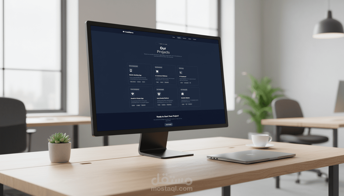 تصميم وتطوير موقع حترافي ومتكامل لوكالة إبداعية أو شركة خدمات تقنية، مع التركيز على تجربة المستخدم السلسة والتصميم العصري. تم بناء المشروع بالكامل باستخدام Tailwind CSS لضمان استجابة كاملة (Fully Responsive) على جميع الأجهزة (سطح المكتب، الأجهزة اللوحية، الهواتف الذكية) وتقديم كود نظيف وقابل للصيانة.