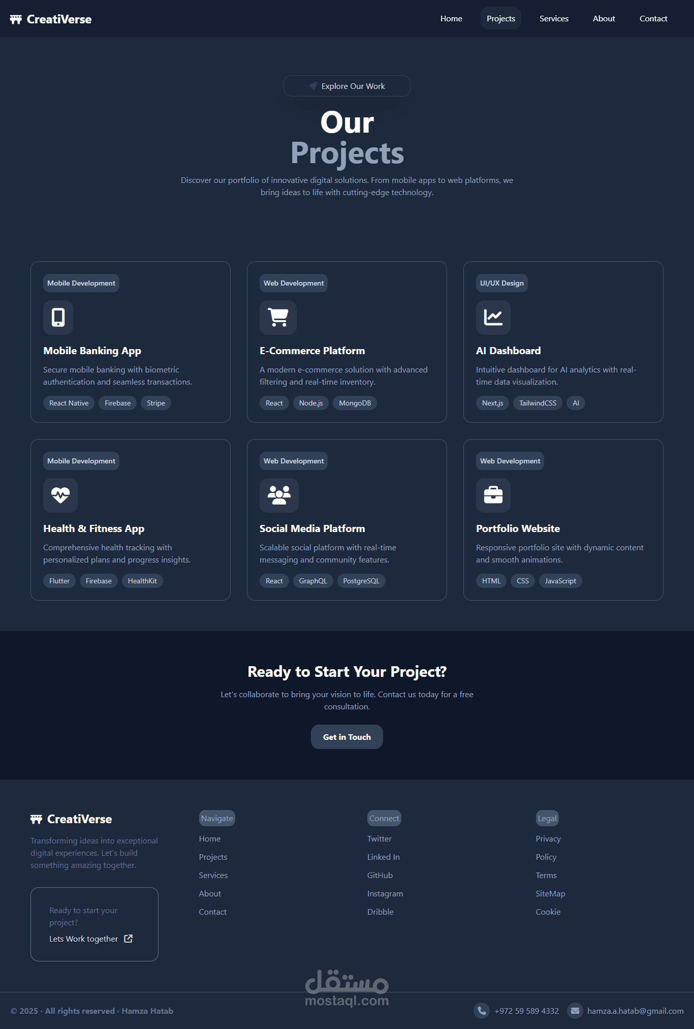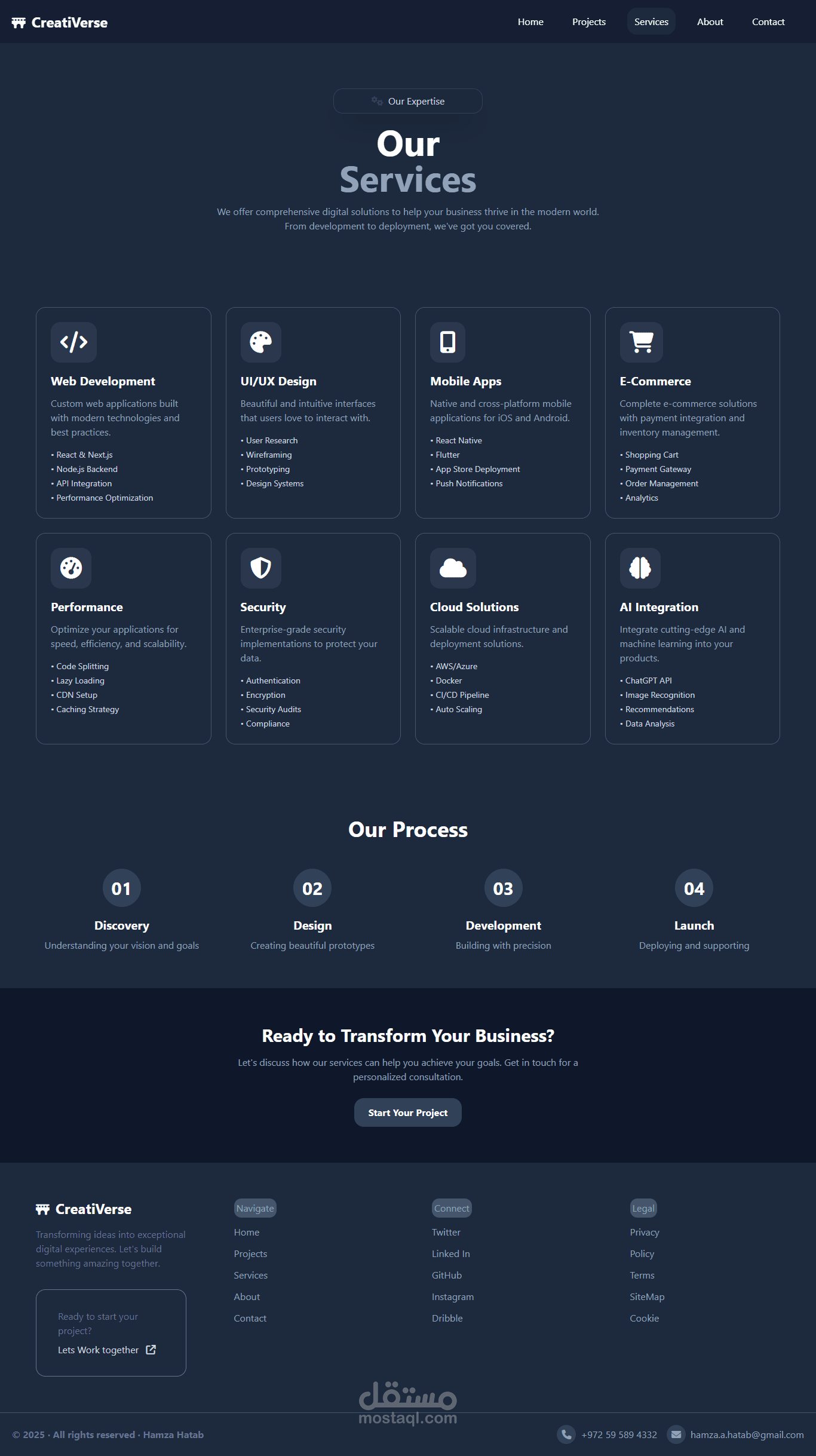الصفحة الرئيسية، الخدمات، المشاريع، من نحن، واتصل بنا، مع عرض تفصيلي للخدمات (تطوير الويب، تطبيقات الجوال، التجارة الإلكترونية، الأمن، والذكاء الاصطناعي) وعملية العمل المتبعة. هذا المشروع يبرز مهاراتي في تحويل التصاميم المعقدة إلى واجهات حية وفعالة باستخدام منهجية Utility-First الخاصة بـ Tailwind CSS.
