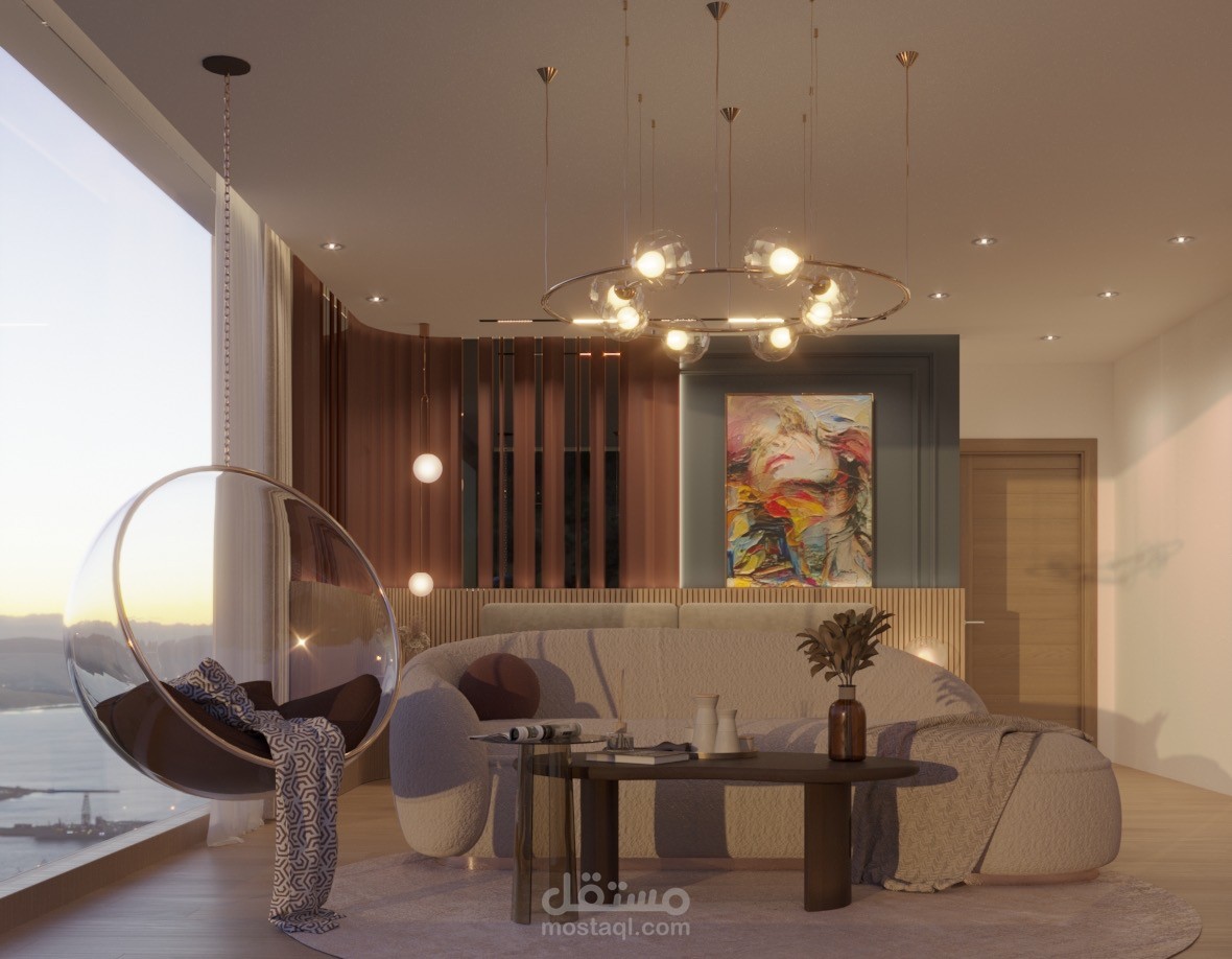 This is a Luxury Modern master bed room featuring a warm, neutral palette and striking design elements. The sophisticated backdrop combines light wood slats with reflective bronze panels, contrasted sharply by a bold, abstract art piece. The space is completed by a comfortable curved sofa, a statement ring chandelier, and a unique transparent hanging chair with scenic views.