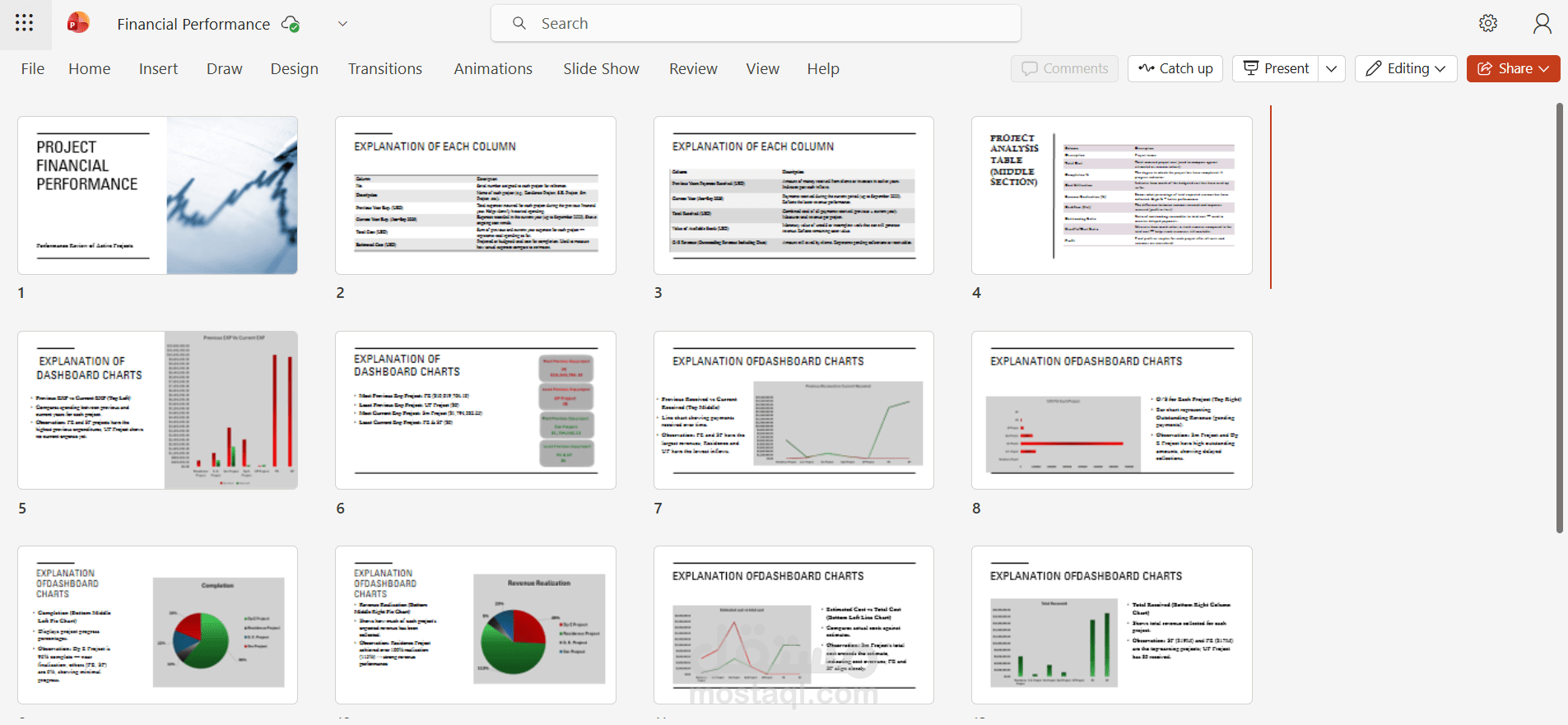 تنظيم الشرائح بشكل منطقي يبدأ من الملخص المالي ثم التحليل ثم التوصيات.