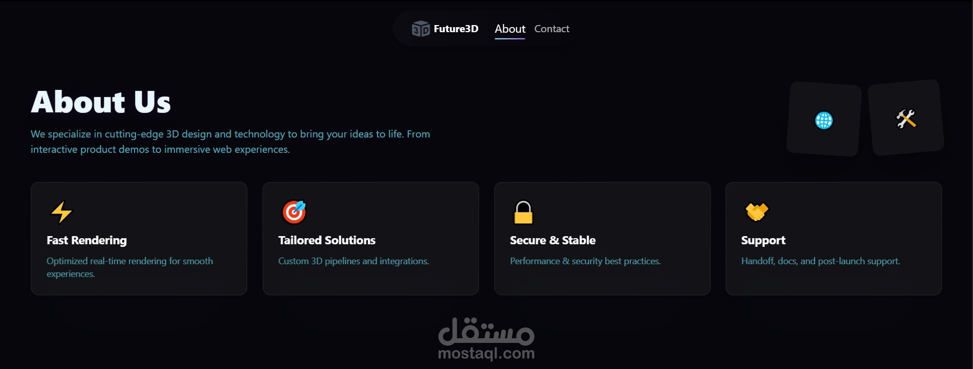 ده مشروع Landing Page تفاعلية بتصميم 3D عصري، معمول بالكامل بـ React + Vite + Tailwind مع دمج Three.js علشان أعمل تجربة مختلفة بصريًا.