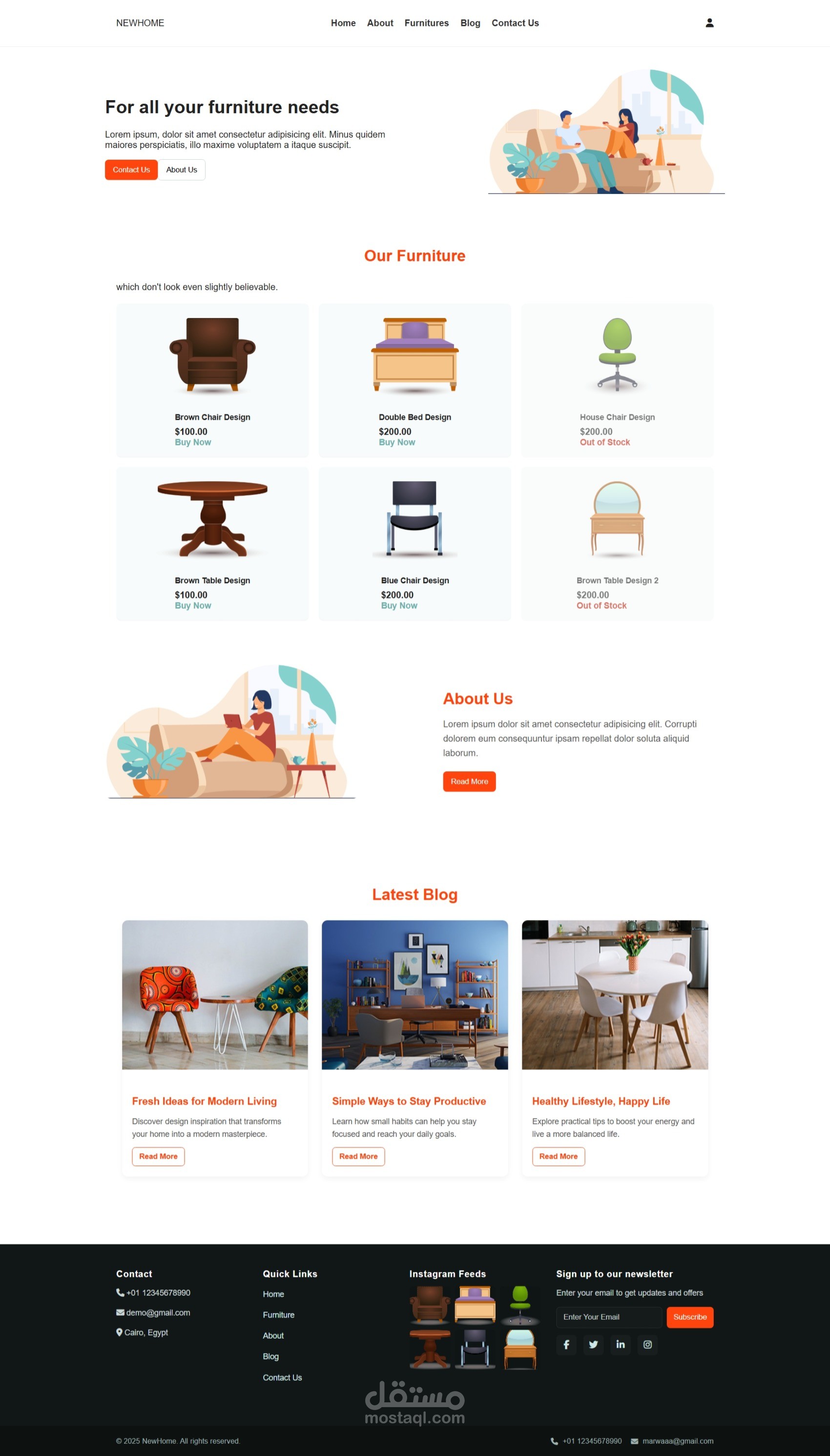 صفحة هبوط عصرية لعرض منتجات الأثاث، بتصميم أنيق يبرز الهوية البصرية ويزيد تفاعل العملاء.
