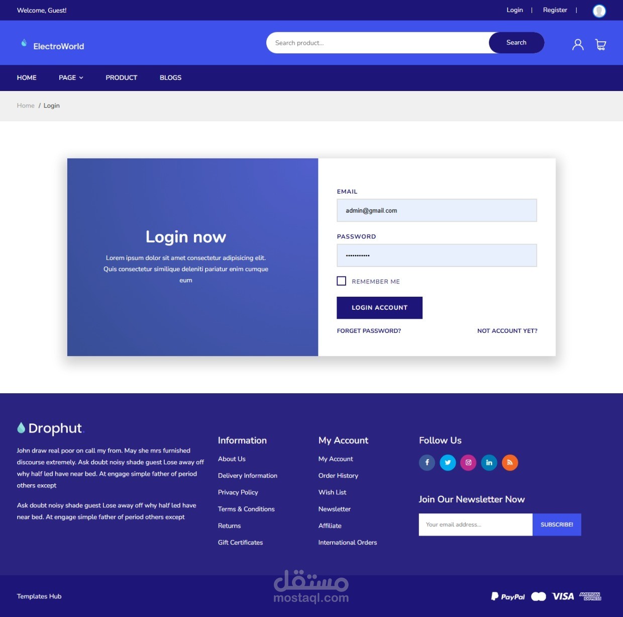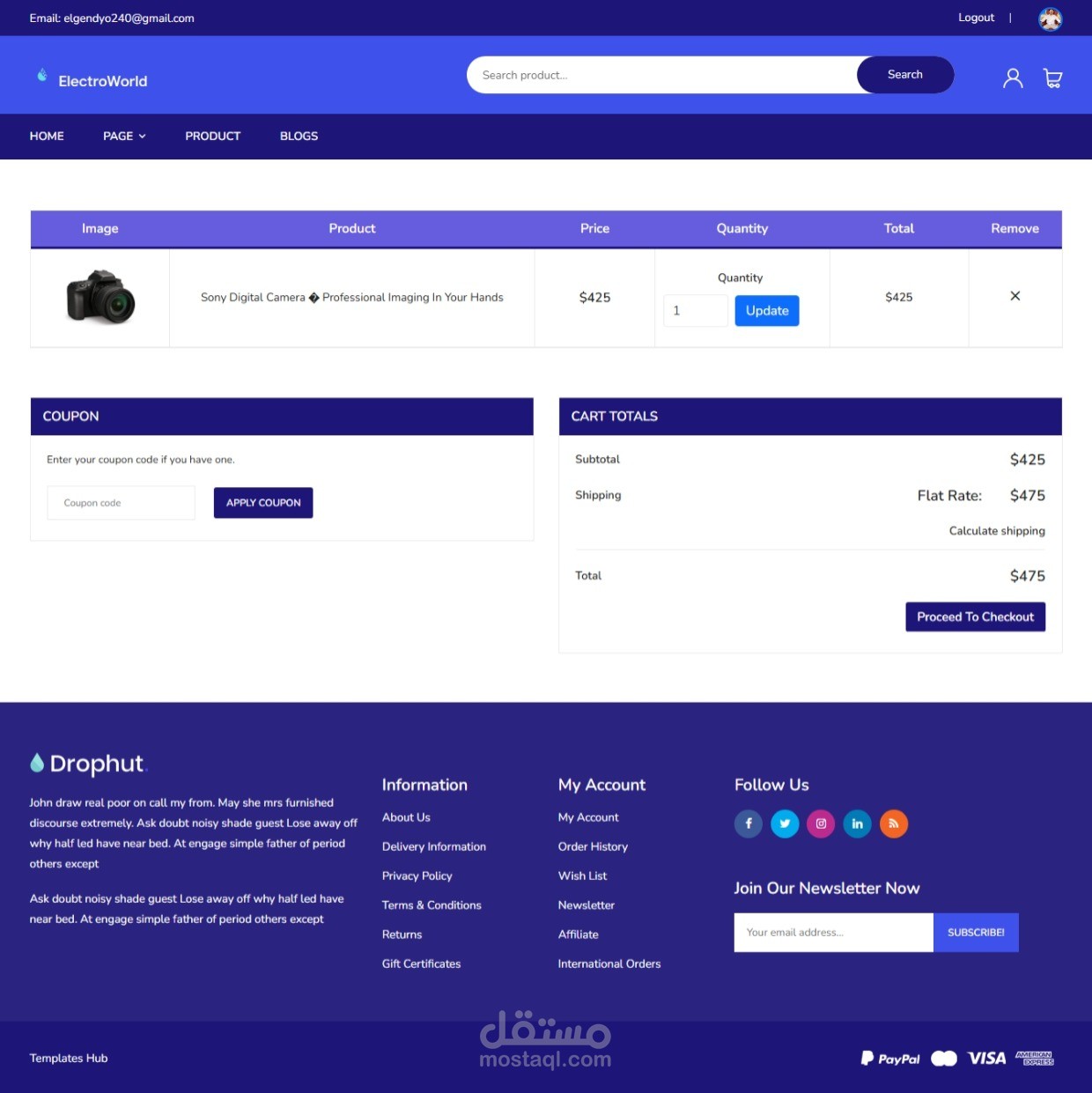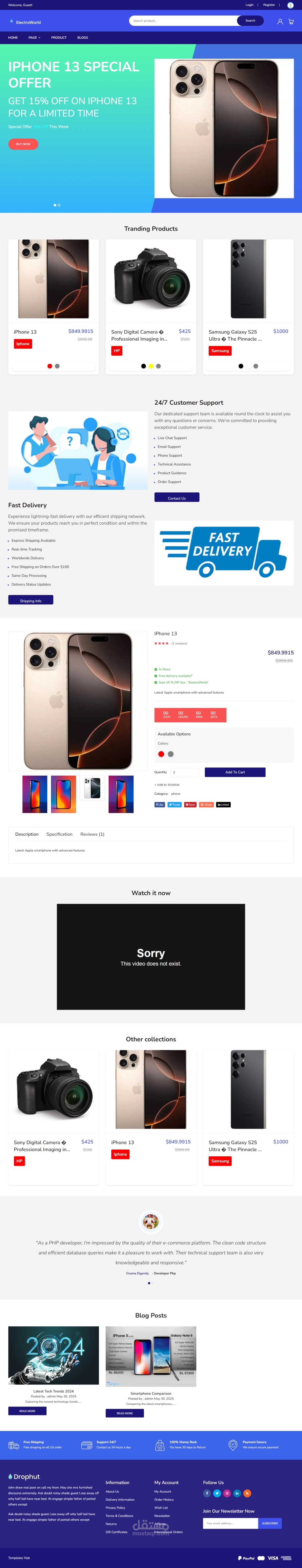 تدعم نظام مستخدمين آمن، إدارة منتجات كاملة (أقسام، علامات تجارية، مخزون)، وسلة تسوق ديناميكية مع إنشاء طلب وفاتورة تلقائيًا.
