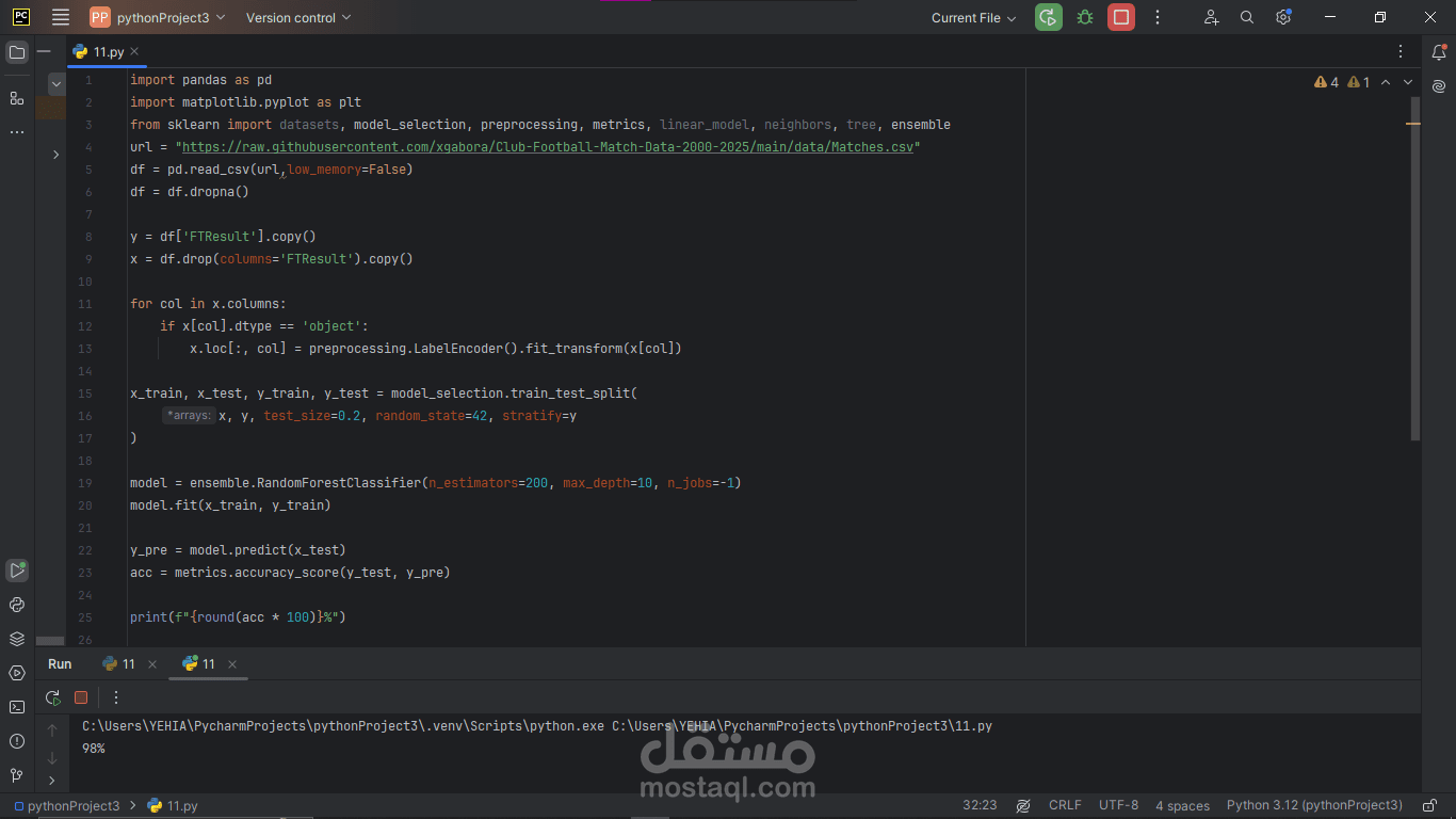 Encoding: Converted every text column (team names, league, dates, and the result label H/D/A) into numeric codes so the model could understand them.