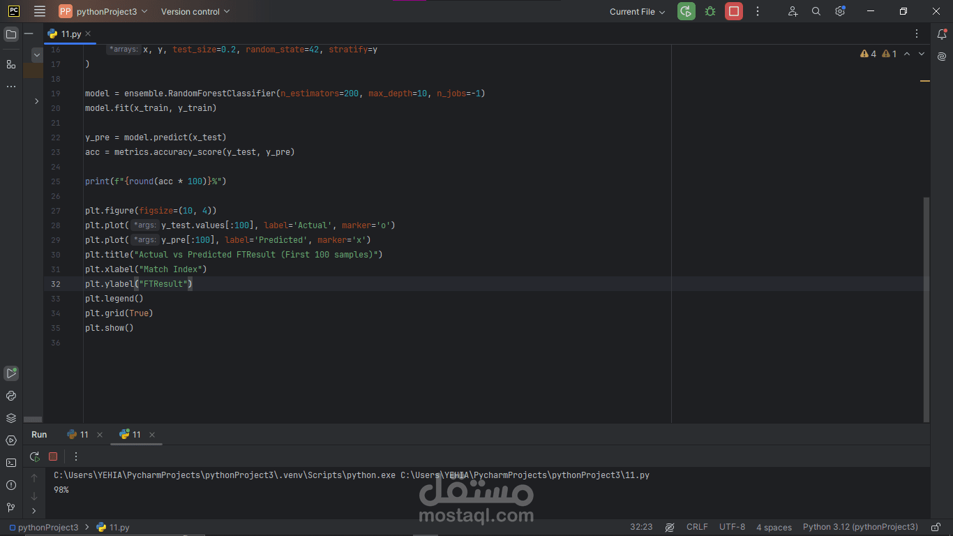 Plotted the first 100 actual vs. predicted FTResult values, marking each point by H (home win), D (draw), or A (away win). Watching the markers overlap so closely was truly exhilarating.