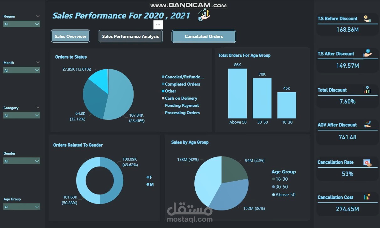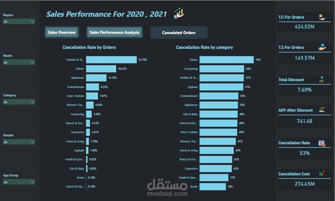 Cancelled Orders: لوحة متخصصة لعرض أسباب إلغاء الطلبات وتأثيرها على الإيرادات.