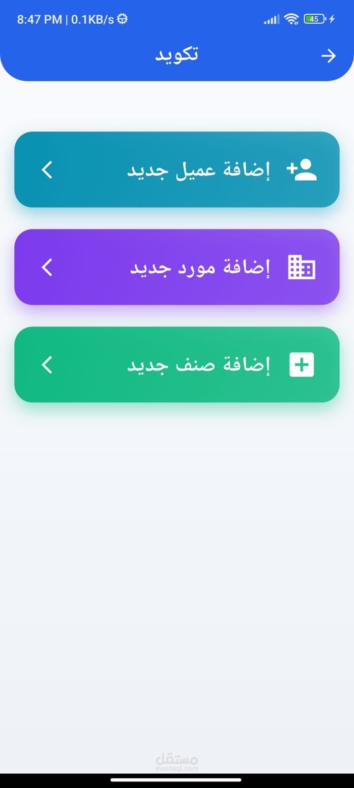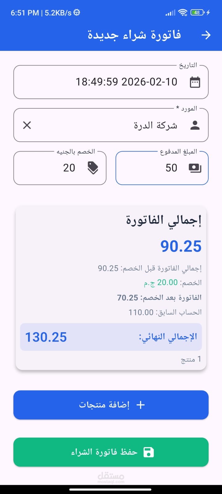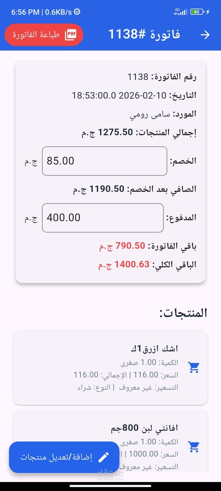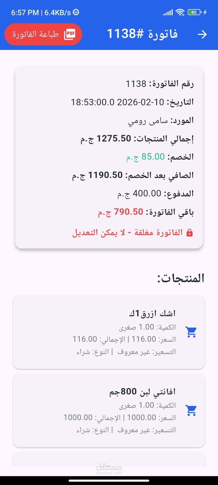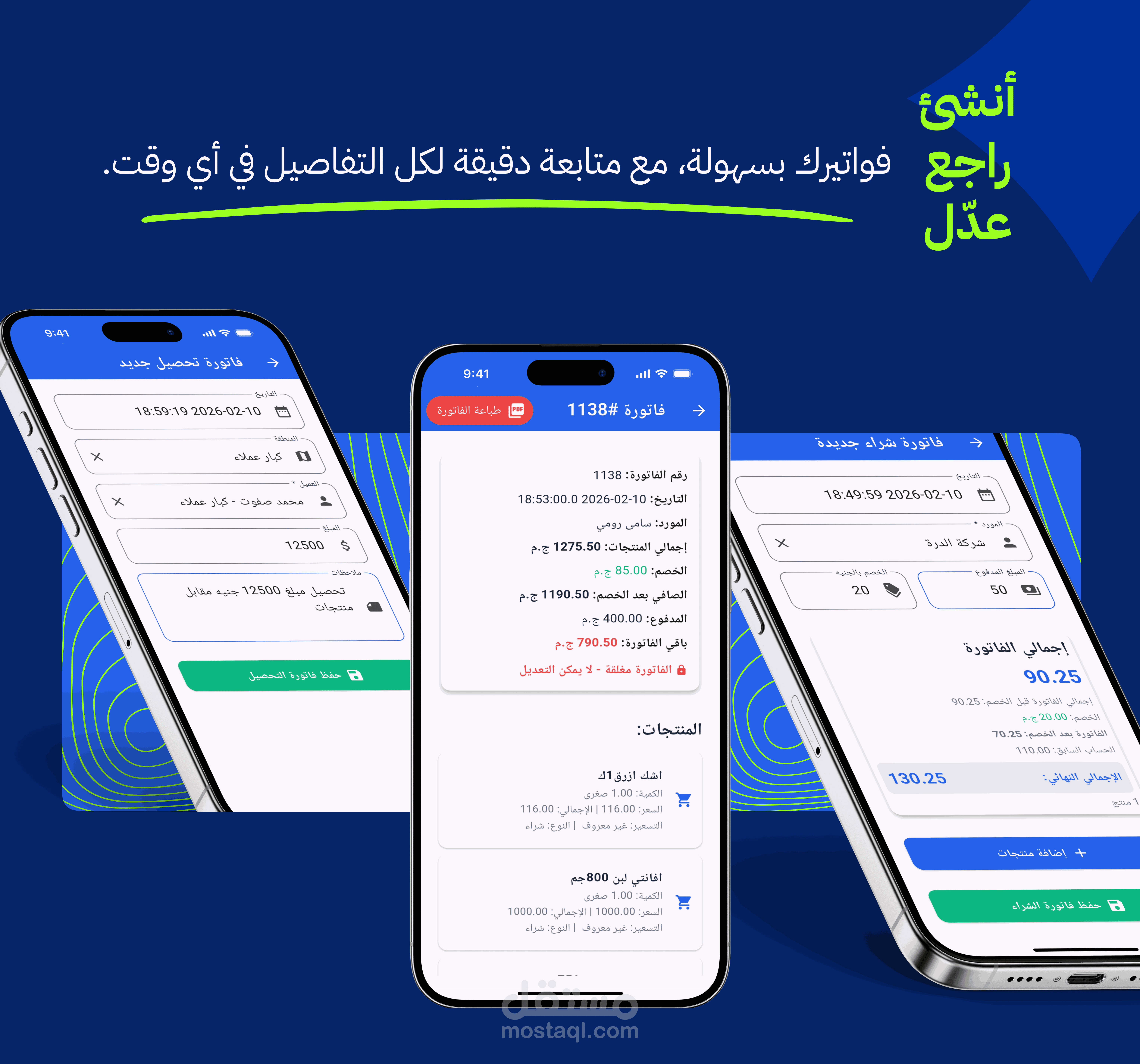 يتيح التطبيق إنشاء الفواتير الجديدة بسهولة، مع إمكانية تعديلها ومراجعتها في أي وقت، إضافة إلى خيار طباعتها مباشرة بصيغة PDF.