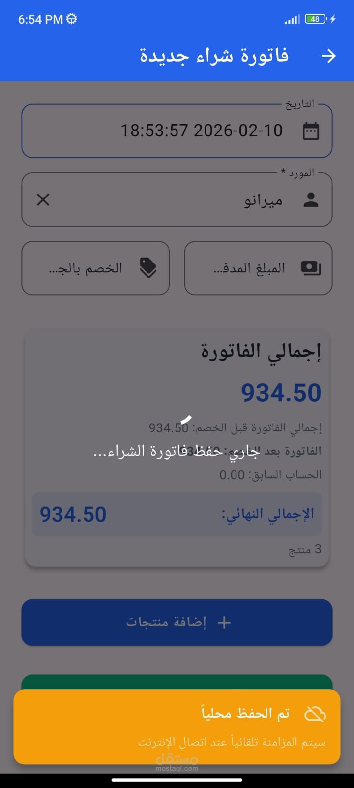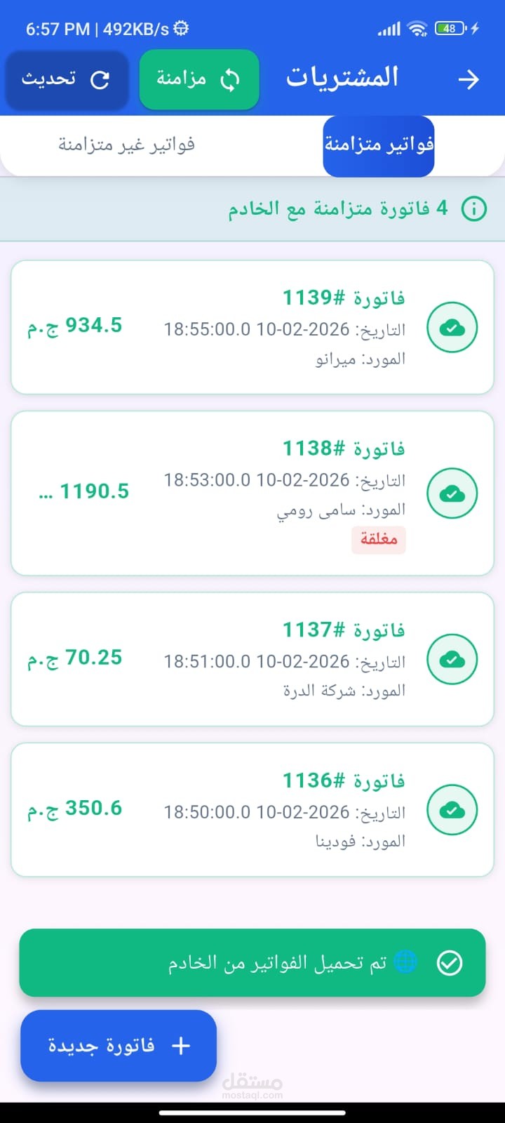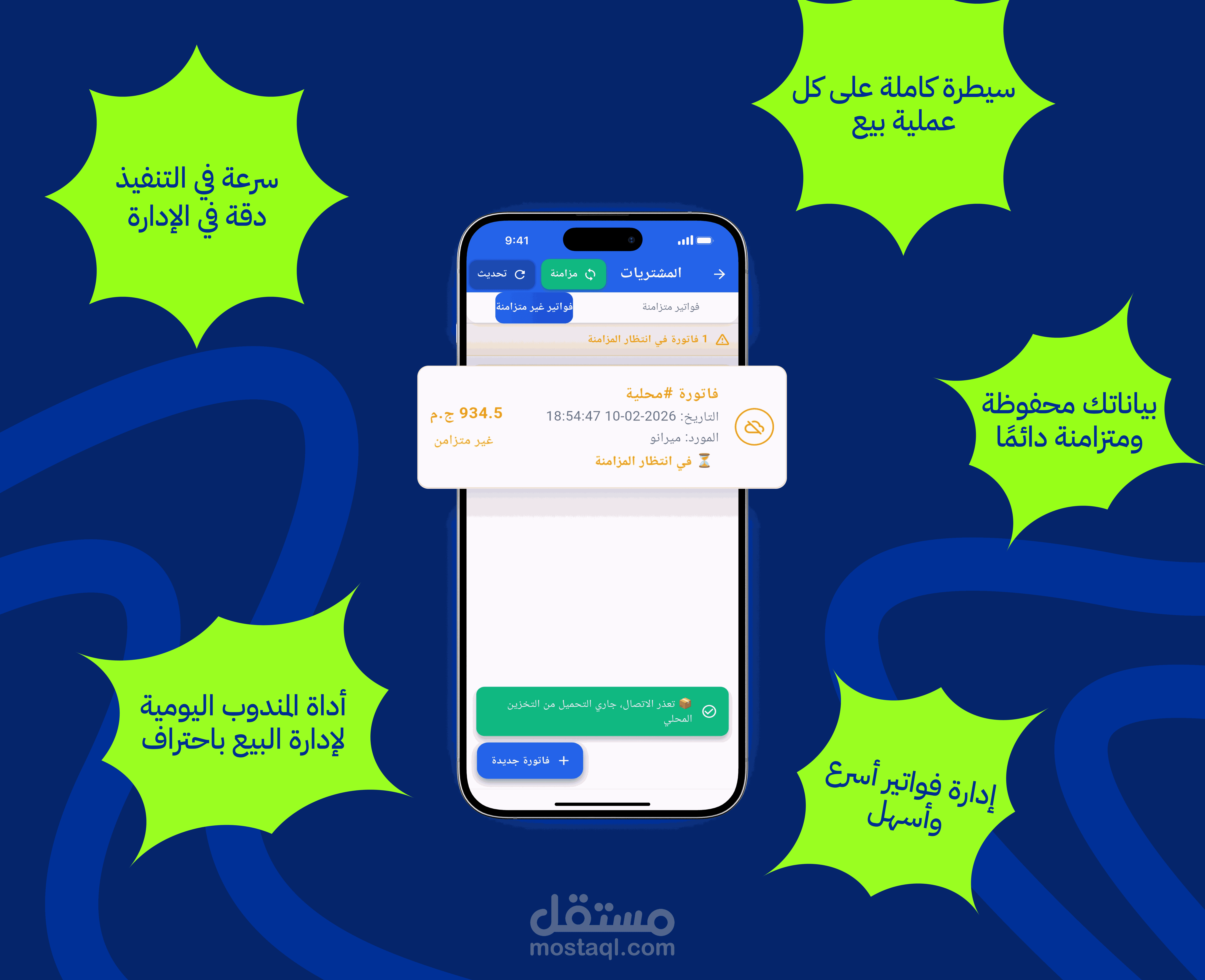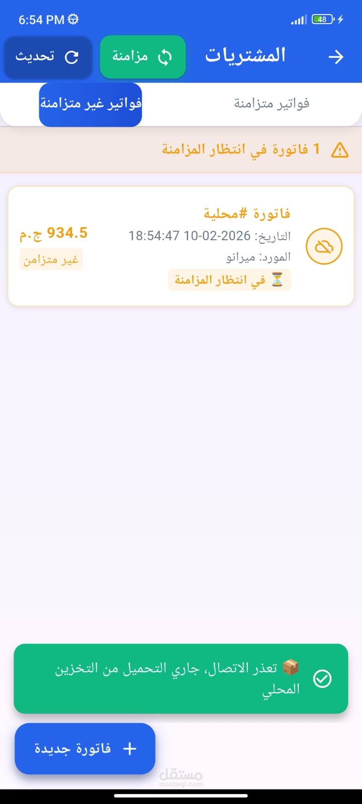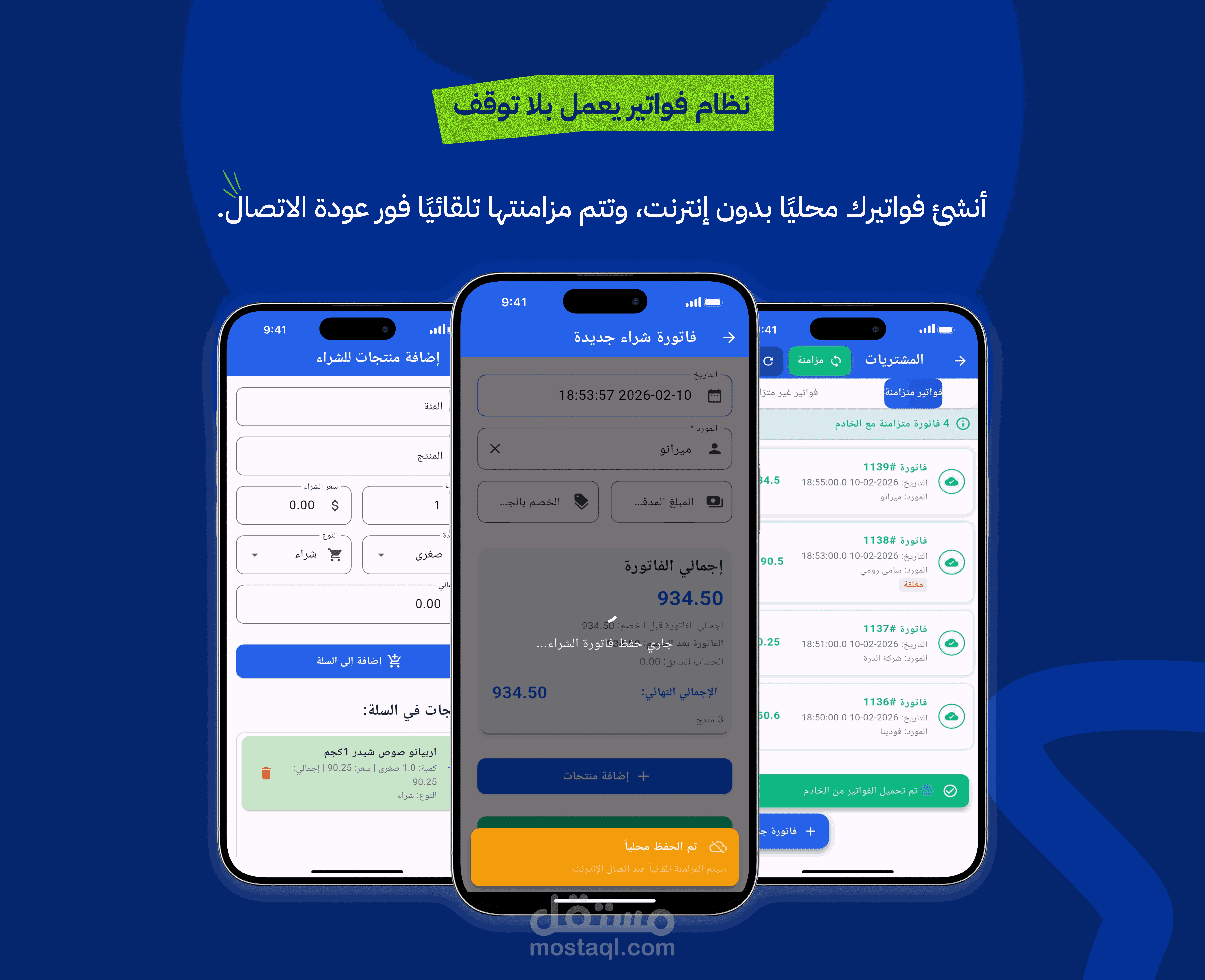 يدعم التطبيق العمل في وضع الاتصال بالإنترنت أو بدونه؛ حيث يتم تخزين الفواتير محليًا عند عدم توفر الاتصال، ثم يقوم تلقائيًا بإعادة المزامنة مع النظام فور عودة الإنترنت، مما يضمن عدم فقدان أي بيانات واستمرار سير العمل بسلاسة.