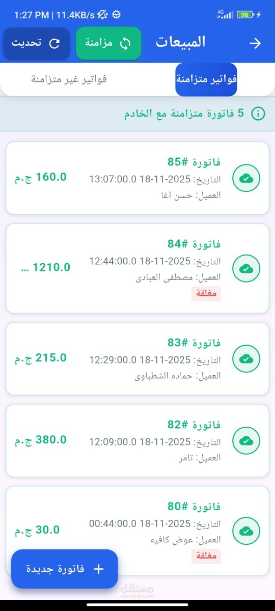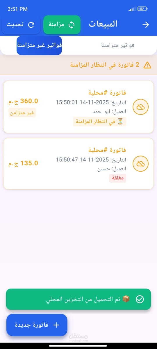 يدعم التطبيق العمل في وضع الاتصال بالإنترنت أو بدونه؛ حيث يتم تخزين الفواتير محليًا عند عدم توفر الاتصال، ثم يقوم تلقائيًا بإعادة المزامنة مع النظام فور عودة الإنترنت، مما يضمن عدم فقدان أي بيانات واستمرار سير العمل بسلاسة.